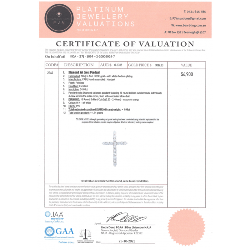 14K ROSE GOLD, 1.08CT TDW DIAMOND, CRUCIFIX PENDANT.