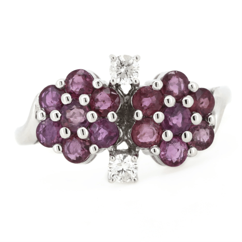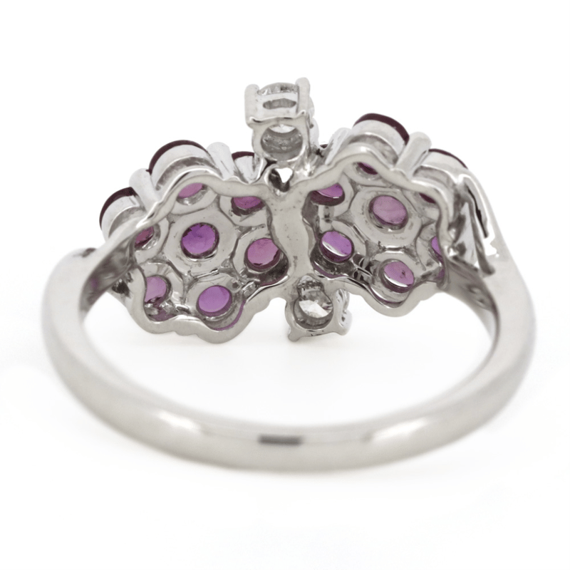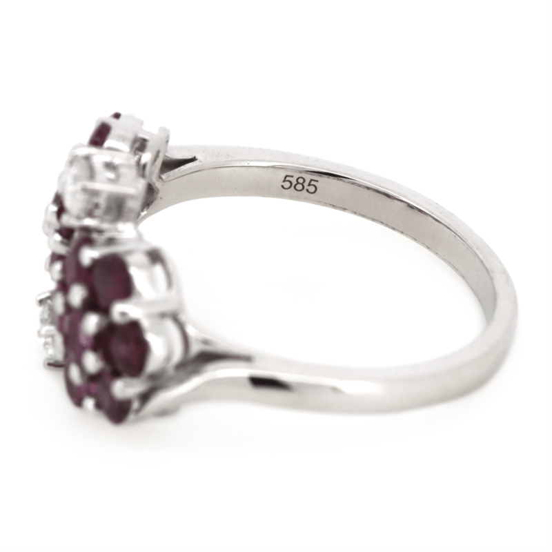 14K WHITE GOLD, RUBY AND DIAMOND, FLORAL RING.