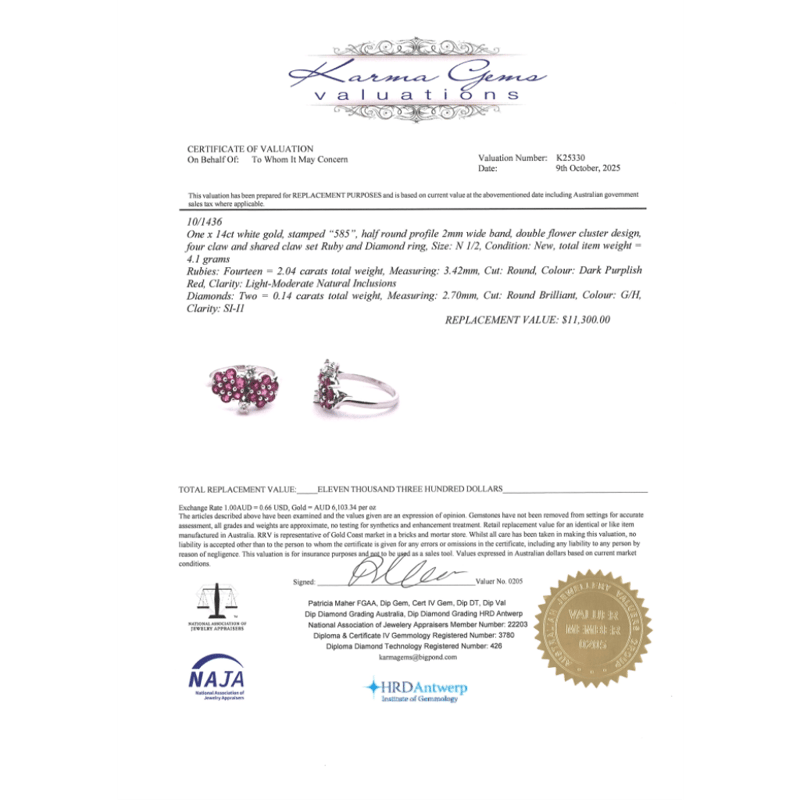 The Design Features, 14 Round Cut, Dark Purplish-Red, Rubies (2.04Ct Tsw, Light-Medium Inclusions), Claw Set. Encompassing The Design Are, 2 Round Brilliant Cut, Diamonds (0.14Ct Tdw, G-H Colour, Si-I1 Clarity), Shared Claw Set. Ring Size N 1/2.