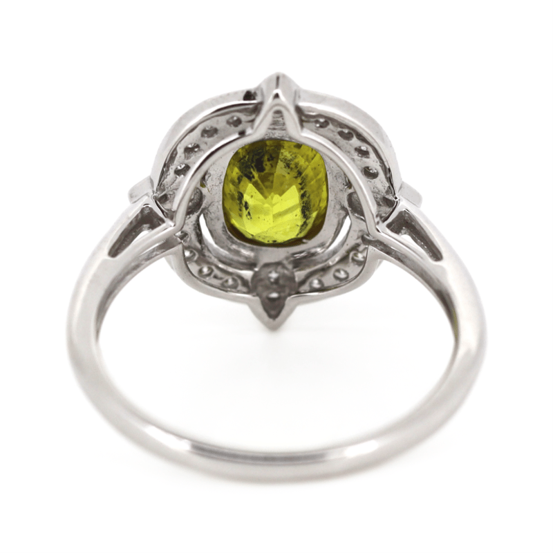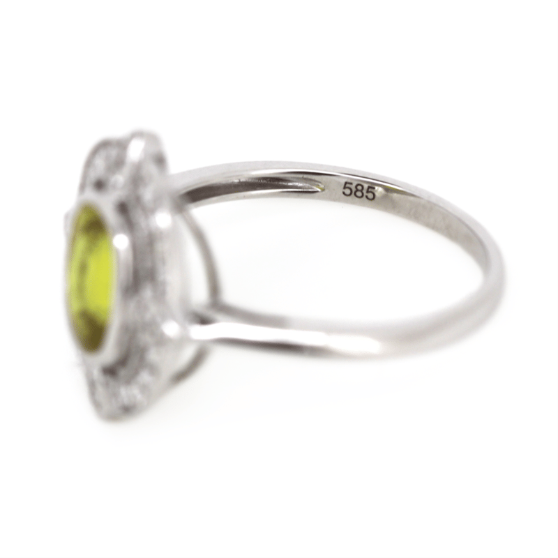 14K WHITE GOLD, YELLOW CEYLON SAPPHIRE AND DIAMOND, HALO DRESS RING.