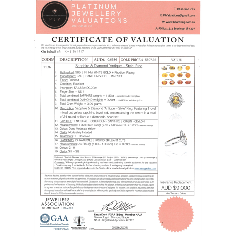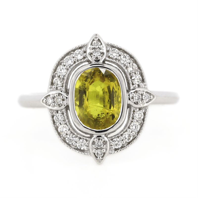 The Centre Features, One Oval Cut, Deep Moderate Yellow, Ceylon Sapphire (1.83Ct, Moderately Included, Enhanced), Bezel Set. Embellishing The Design Are, 24 Round Brilliant Cut, Diamonds (0.20Ct Tdw, G-H Colour, Si1-Si2 Clarity), Bead Set. Ring Size N 1/2.