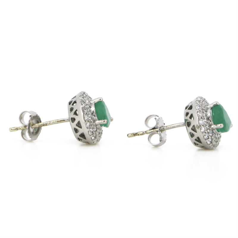 14K WHITE GOLD, EMERALD AND DIAMOND, DOUBLE HALO STUD EARRINGS.
