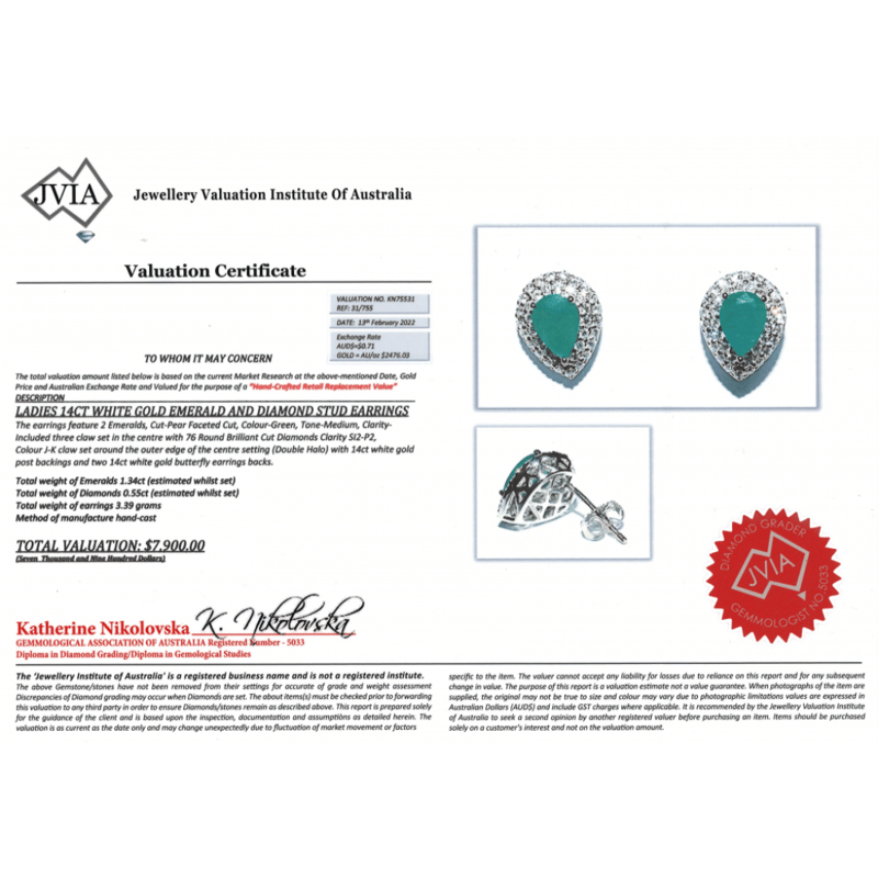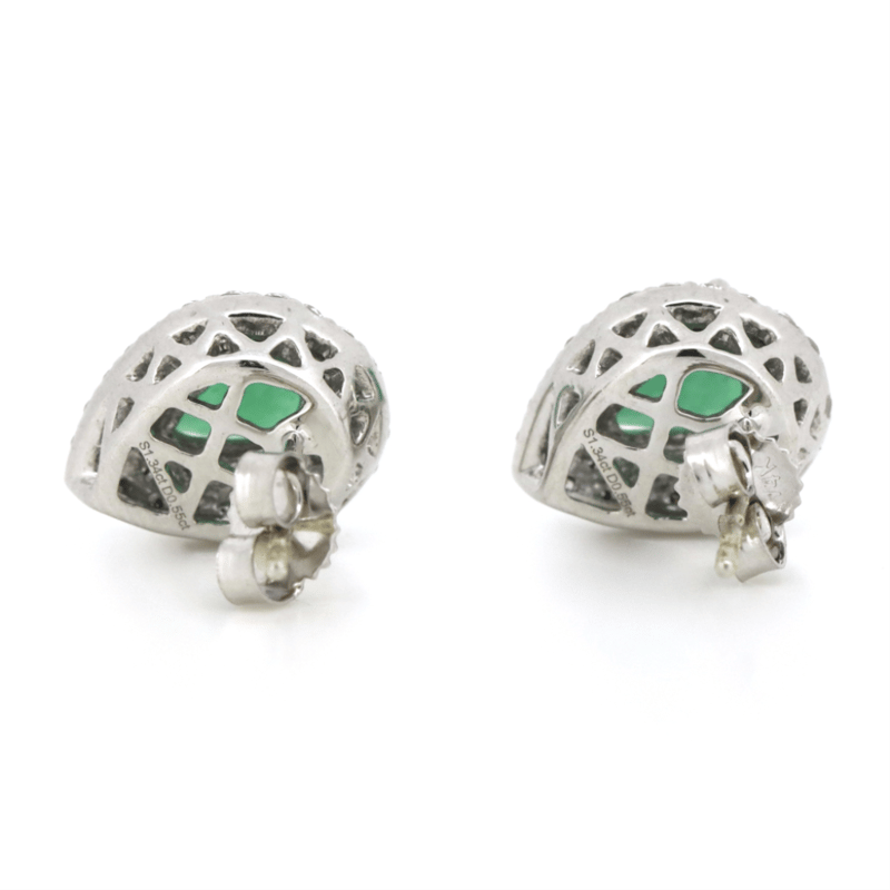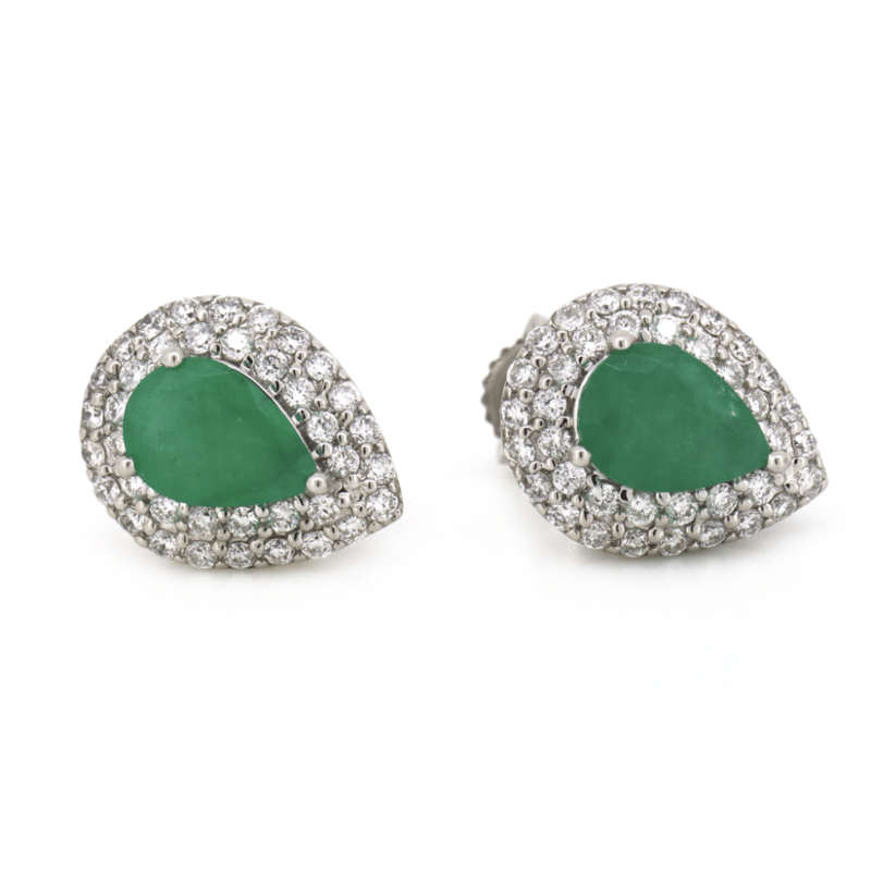 The Centres Feature, 2 Pear Faceted Cut, Medium Green, Emeralds (1.34Ct Tsw, Included), 3 Claw Set. Surrounding The Centres In Double Halos Are, 76 Round Brilliant Cut, Diamonds (0.55Ct Tdw, J-K Colour, Si2-P2 Clarity), Claw Set. The Earrings Have Post Backs With 14K White Gold Butterfly Clasps.