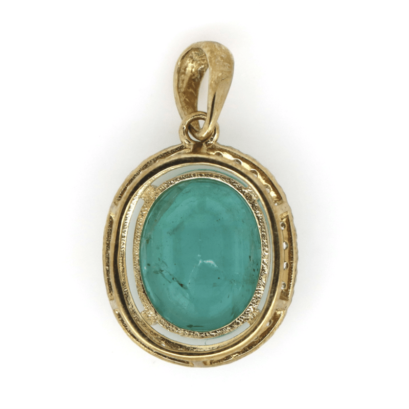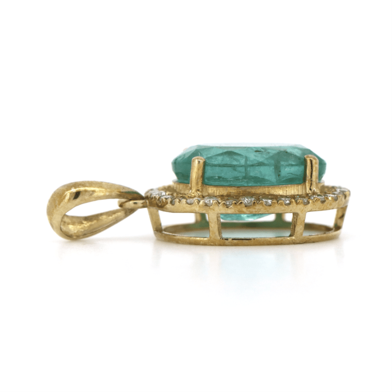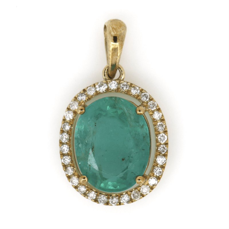 9K YELLOW GOLD, EMERALD AND DIAMOND, HALO PENDANT.