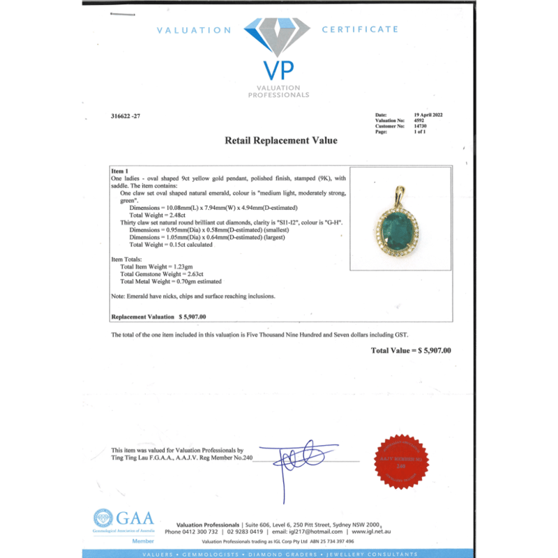 The Centre Features, One Oval Faceted Cut, Medium Light Green, Emerald (2.48Ct, Has Nicks, Chips And Surface Reaching Inclusions), Claw Set. Surrounding The Centre In A Halo Are, 30 Round Brilliant Cut, Diamonds (0.15Ct Tdw, G-H Colour, Si1-I2 Clarity), Claw Set.