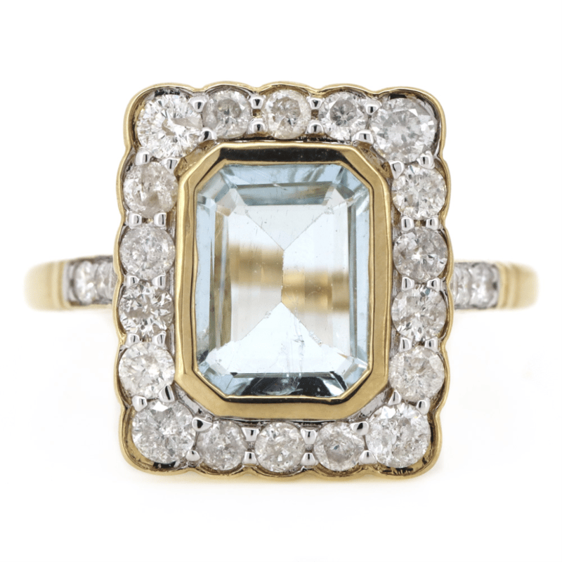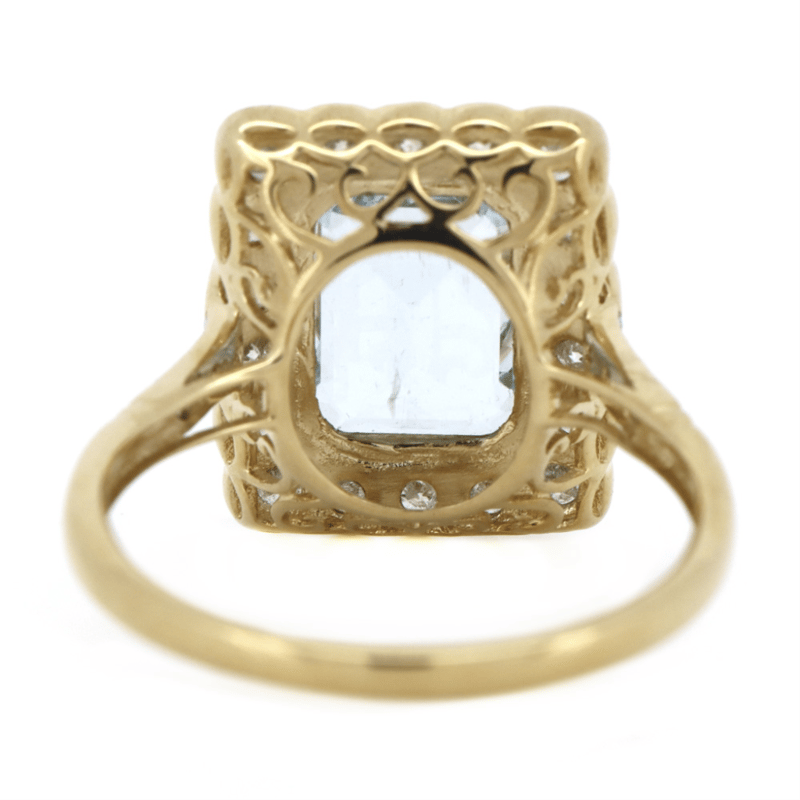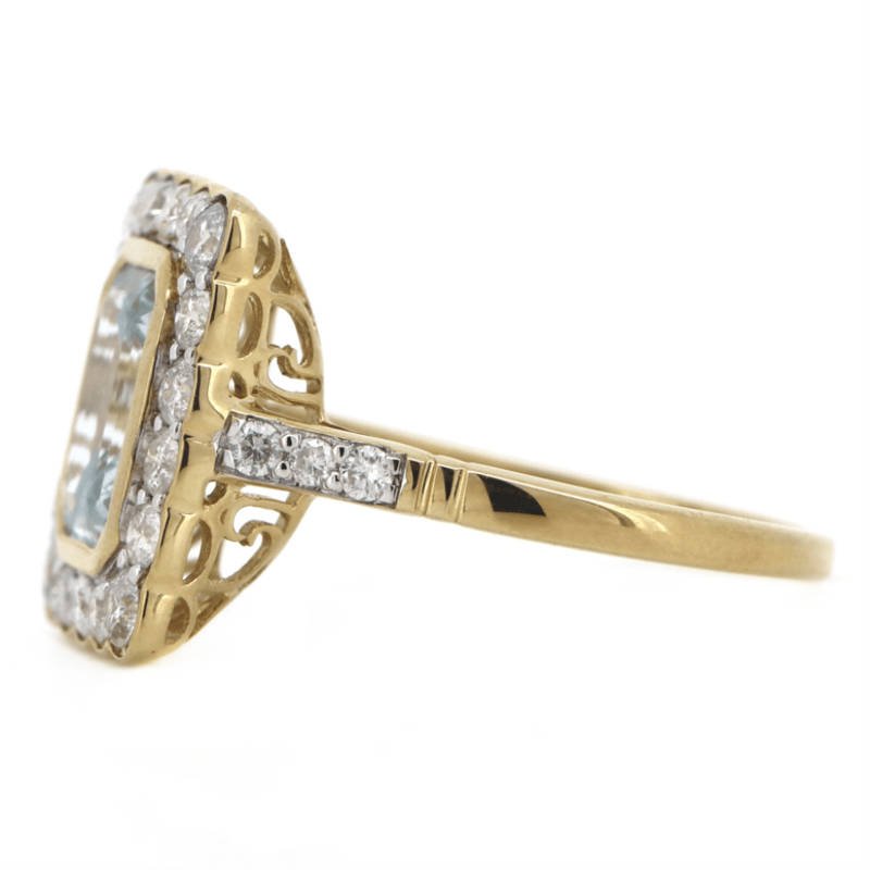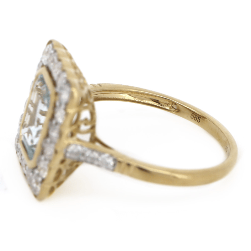 14K YELLOW GOLD, AQUAMARINE AND DIAMOND, HALO RING.