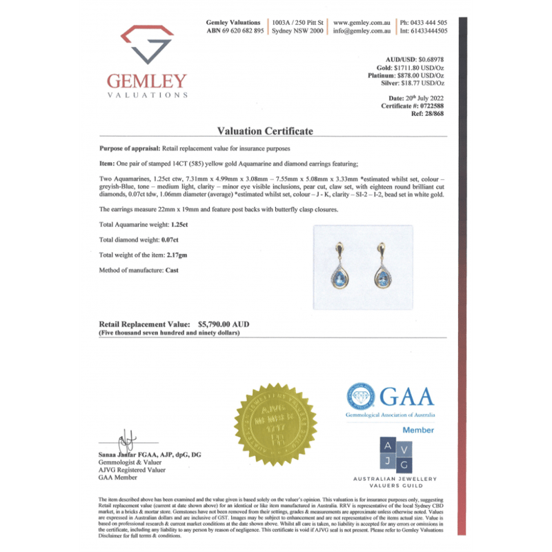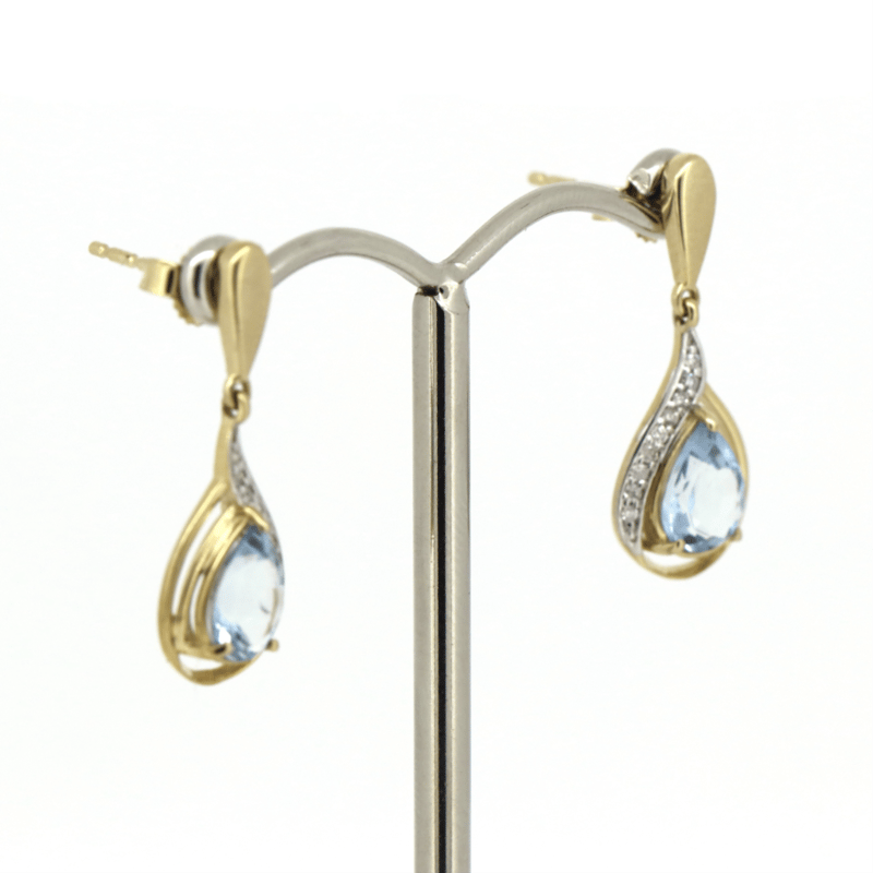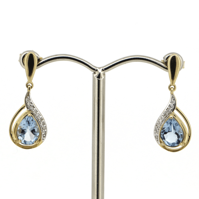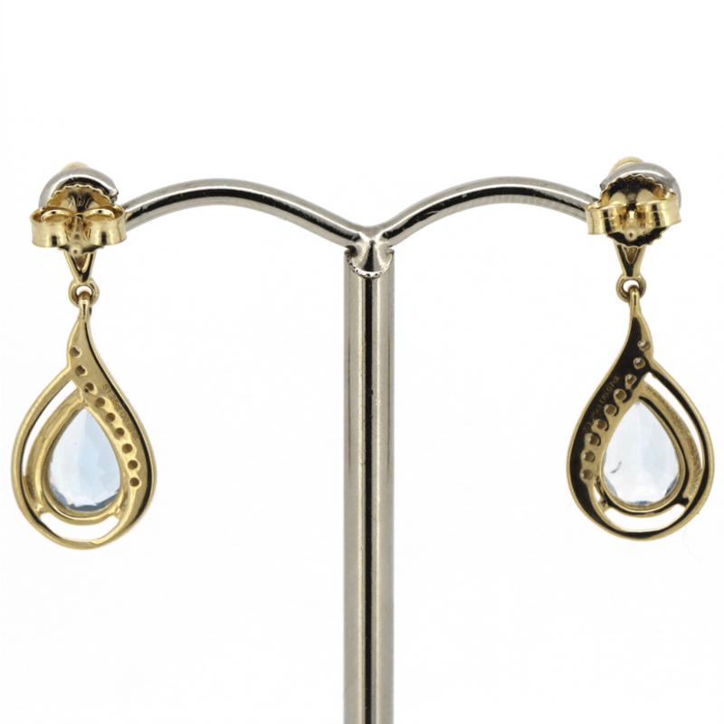 The Centres Feature, 2 Pear Cut, Greyish-Blue, Aquamarines (1.25Ct Tsw, Minor Eye Visible Inclusions), Claw Set. Decorating The Centres Are, 18 Round Brilliant Cut, Diamonds (0.07Ct Tdw, J-K Colour, Si2-I2 Clarity), Bead Set In White Gold. The Earrings Have Post Backs With 14K Yellow Gold Butterfly Clasps.