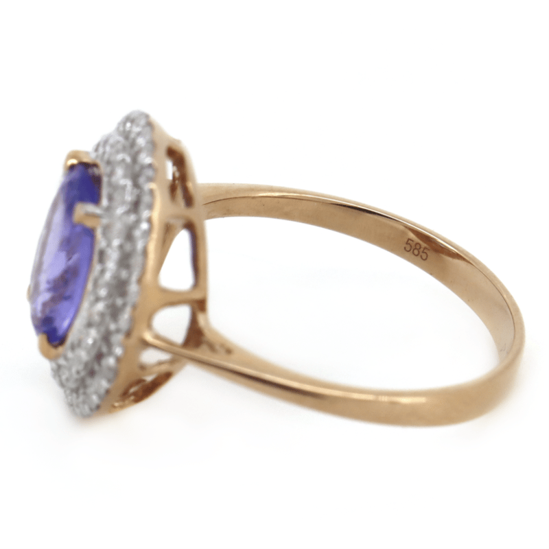14K ROSE GOLD, TANZANITE AND DIAMOND, DOUBLE HALO RING.