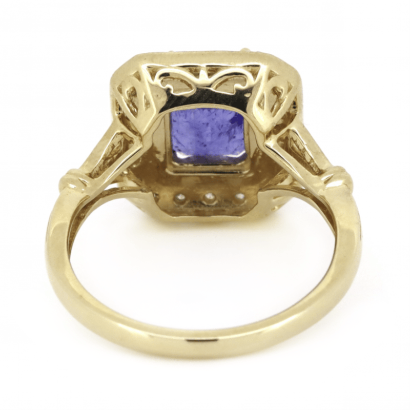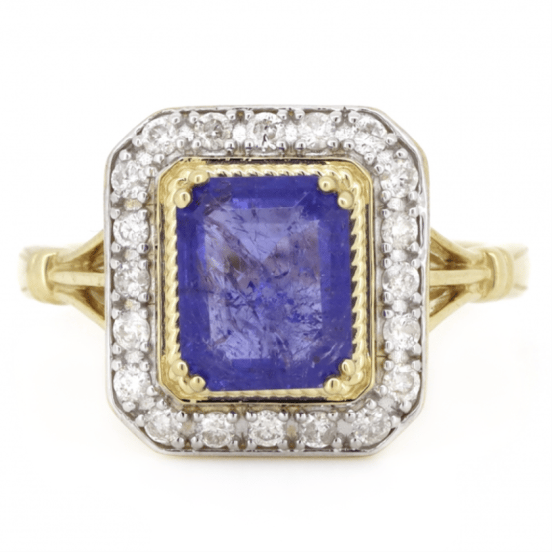 14K YELLOW GOLD, TANZANITE AND DIAMOND, ANTIQUE INSPIRED HALO RING.