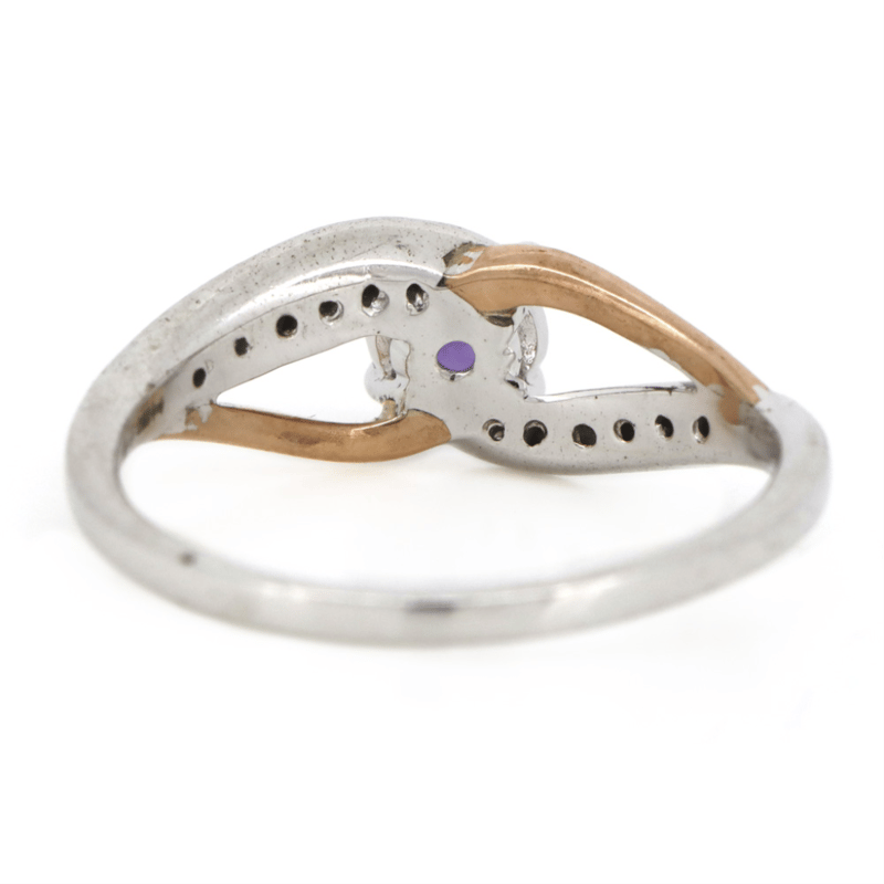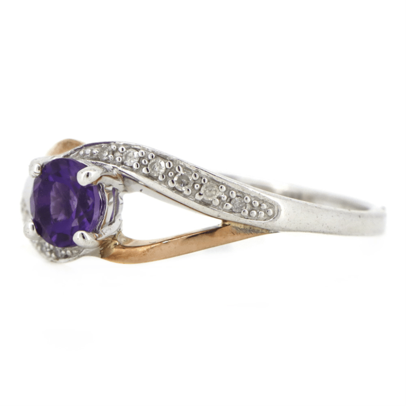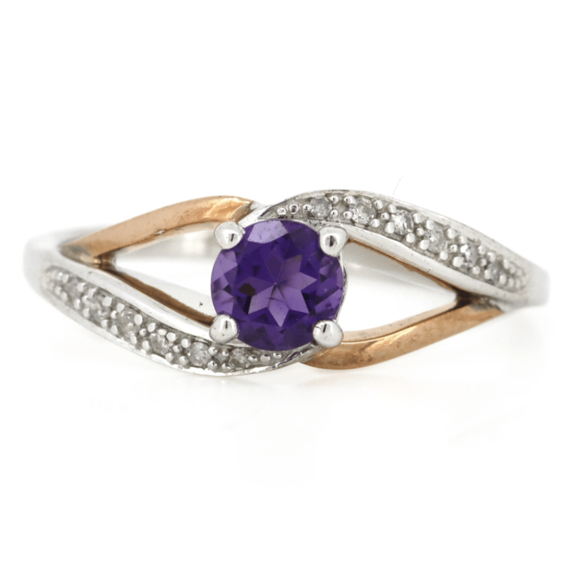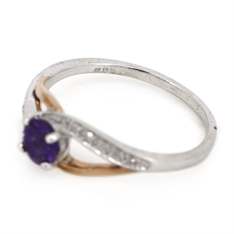 9K ROSE GOLD/STERLING SILVER, AMETHYST AND DIAMOND, DRESS RING.