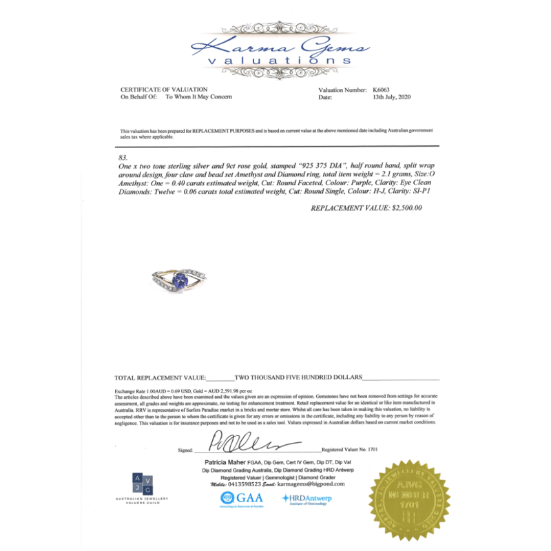 The Centre Features, One Round Faceted Cut, Purple, Amethyst (0.40Ct, Eye Clean Clarity), 4 Claw Set. Decorating The Split Band Are, 12 Round Single Cut, Diamonds (0.06Ct Tdw, H-J, Si-P1 Clarity), Bead Set. Ring Size O.