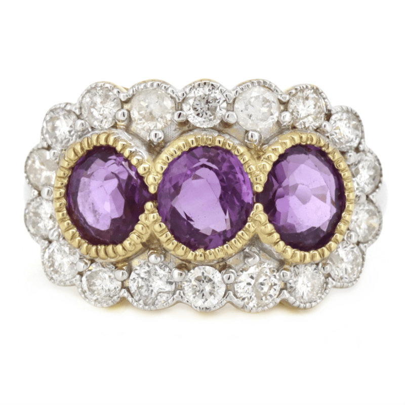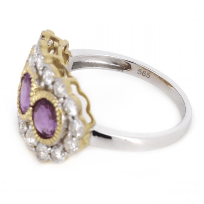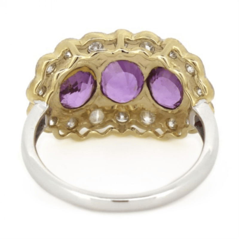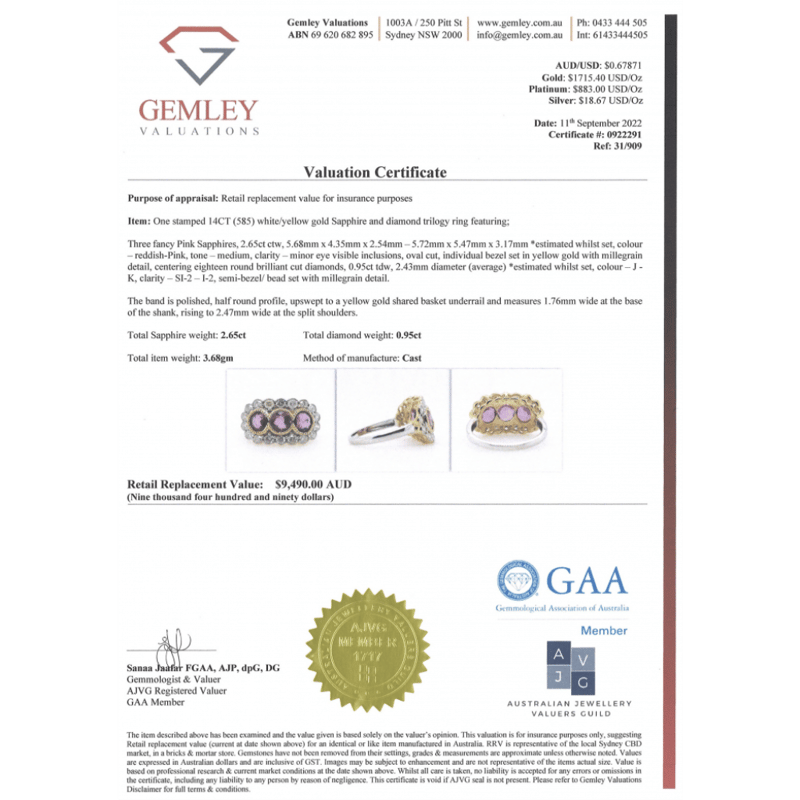14K WHITE/YELLOW GOLD, PINK SAPPHIRE AND DIAMOND, HALO TRILOGY RING. The Design Features, 3 Oval Cut, Reddish-Pink, Sapphires (2.65Ct Tsw, Minor Eye Visible Inclusions), Bezel Set In Yellow Gold With Millegrain Detail. Encompassing The Design Are, 18 Round Brilliant Cut, Diamonds (0.95Ct Tdw, J-K Colour, Si2-I2 Clarity), Semi-Bezel/Bead Set With Millegrain Detail. Ring Size N. Valuations Provided by an Independent Third-Party Professional Not Directly Associated With Lloyds Auctions at AUD $$9,490.00This valuation has been conducted by an independent third-party professional. The valuation amount is an assessment by the issuing valuer and does not reflect the auction value of the item. Any inquiries regarding the valuation should be directed to the issuing valuer (refer to contact details on the certificate), as Lloyds Auctions has no affiliation or influence over the valuation, the valuer, or the stated amount. Condition: Good - Refer Images 0645973+1336