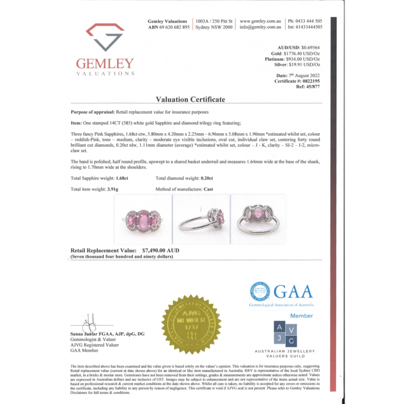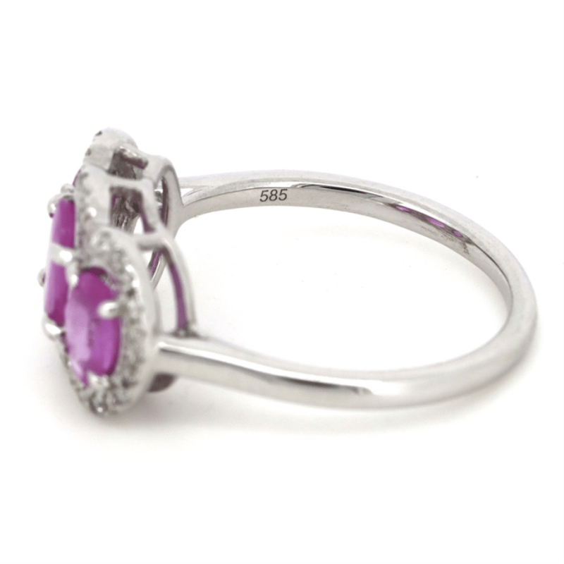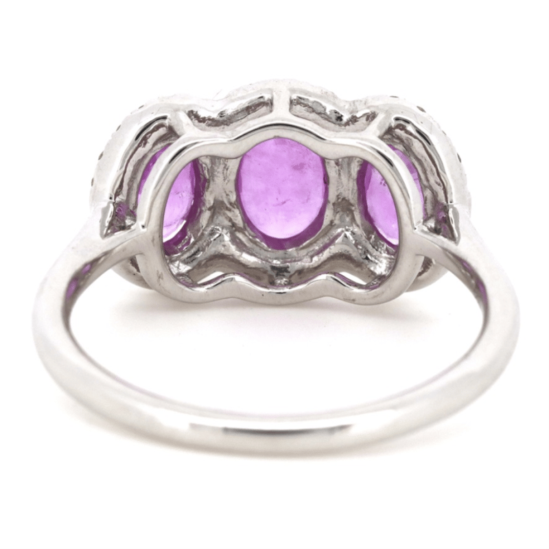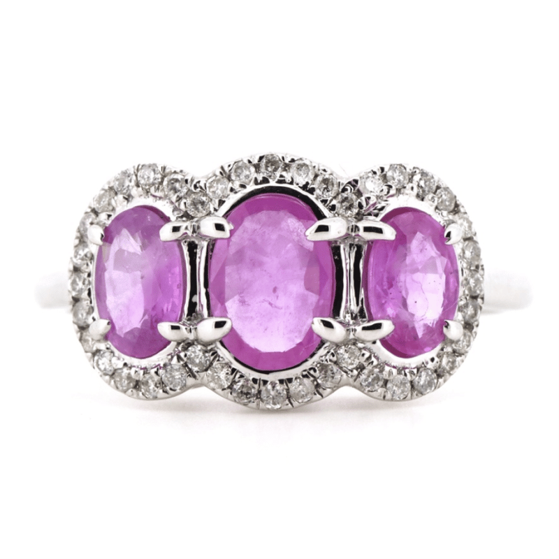 The Design Features, 3 Oval Cut, Reddish-Pink, Sapphires (1.68Ct Tsw, Moderate Eye Visible Inclusions), Claw Set. Surrounding The Centres In A Halo Are, 40 Round Brilliant Cut, Diamonds (0.20Ct Tdw, J-K Colour, Si2-I2 Clarity), Claw Set. Ring Size O 1/2.