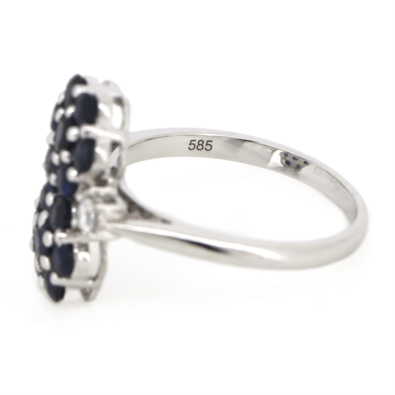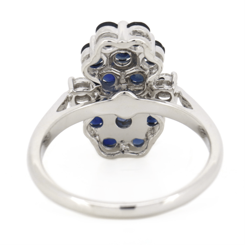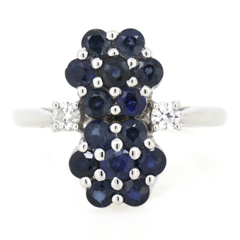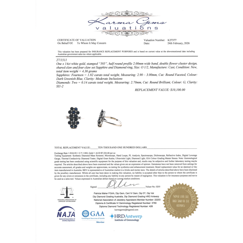 14K WHITE GOLD, BLUE SAPPHIRE AND DIAMOND, FLOWER RING. The Design Features, 14 Round Faceted Cut, Sapphires (1.82Ct Tsw, Moderate Inclusions), Shared Bead Set In White Gold. Embellishing The Centre Are, 2 Round Brilliant Cut, Diamonds (0.14Ct Tdw, G Colour, Si1-2 Clarity ), 4 Claw Set. Valuations Provided by an Independent Third-Party Professional Not Directly Associated With Lloyds Auctions at AUD $$10,100.00This valuation has been conducted by an independent third-party professional. The valuation amount is an assessment by the issuing valuer and does not reflect the auction value of the item. Any inquiries regarding the valuation should be directed to the issuing valuer (refer to contact details on the certificate), as Lloyds Auctions has no affiliation or influence over the valuation, the valuer, or the stated amount. Condition: Good - Refer Images 0645973+1353