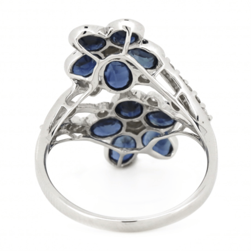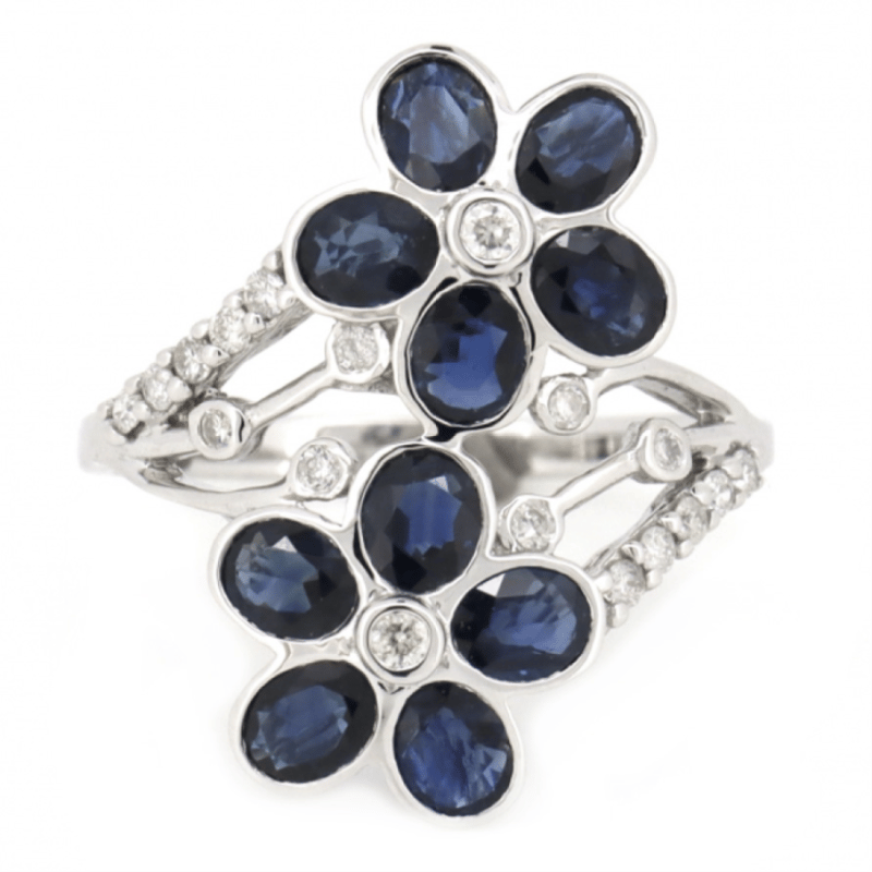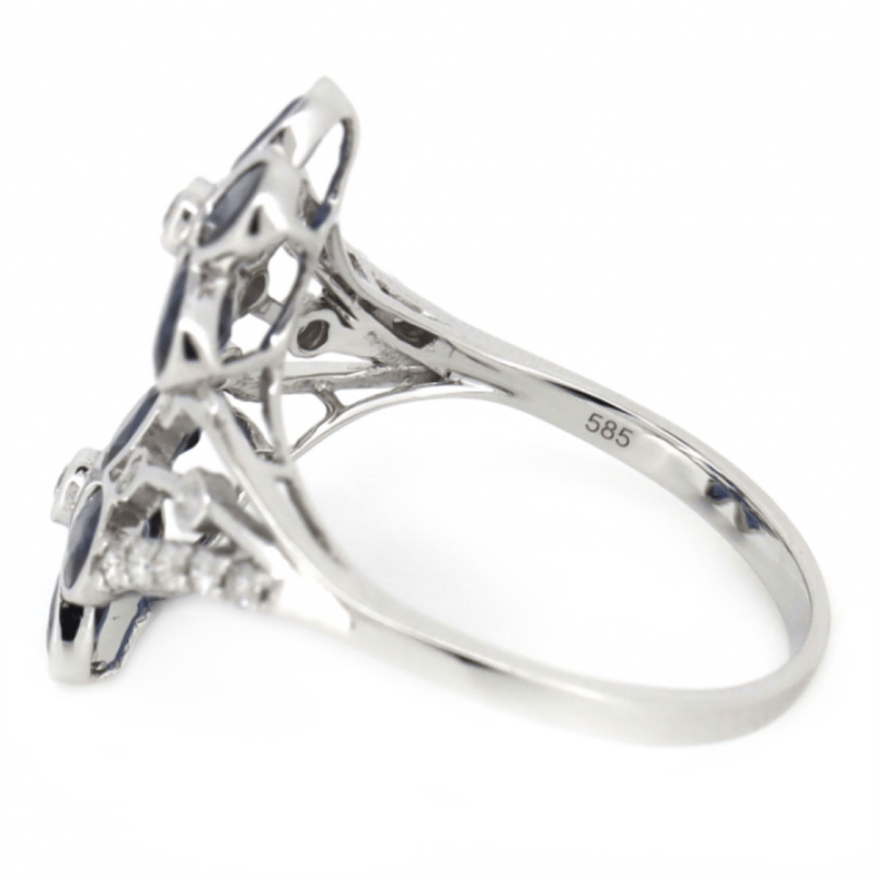 14K WHITE GOLD, BLUE SAPPHIRE AND DIAMOND, FLORAL RING.