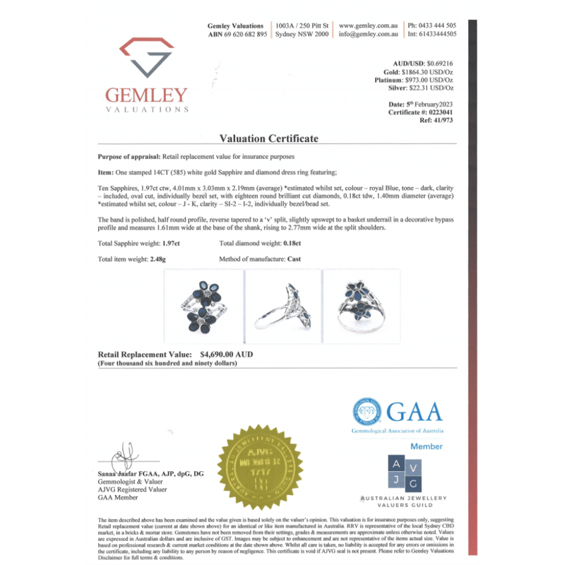 The Design Features, 10 Oval Cut, Dark Royal Blue, Sapphires (1.97Ct Tsw, Included), Bezel Set. Decorating The Design Are, 18 Round Brilliant Cut, Diamonds (0.18Ct Tdw, J-K Colour, Si2-I2 Clarity), Bezel/Bead Set. Ring Size K 1/2.