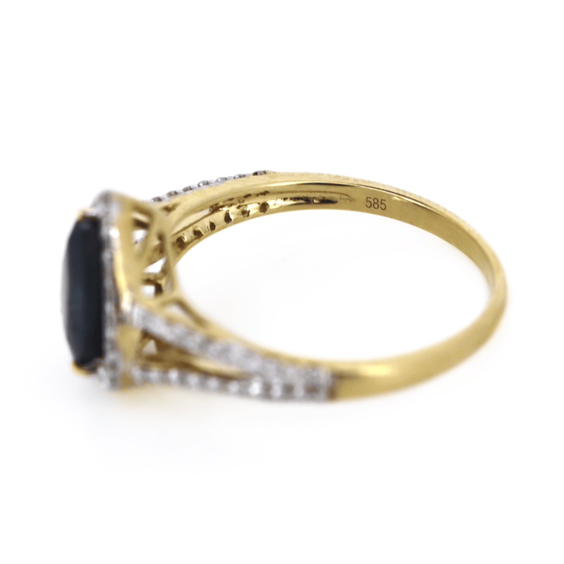 14K YELLOW GOLD, BLUE SAPPHIRE AND DIAMOND, HALO SPLIT BAND RING.