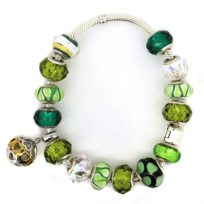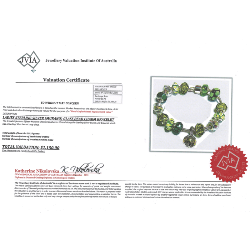 The Bracelet Features, 15 Sterling Silver And Murano Glass Charms. The Sterling Silver Snake Link Bracelet Has A Sterling Silver Snap Clasp Closure.