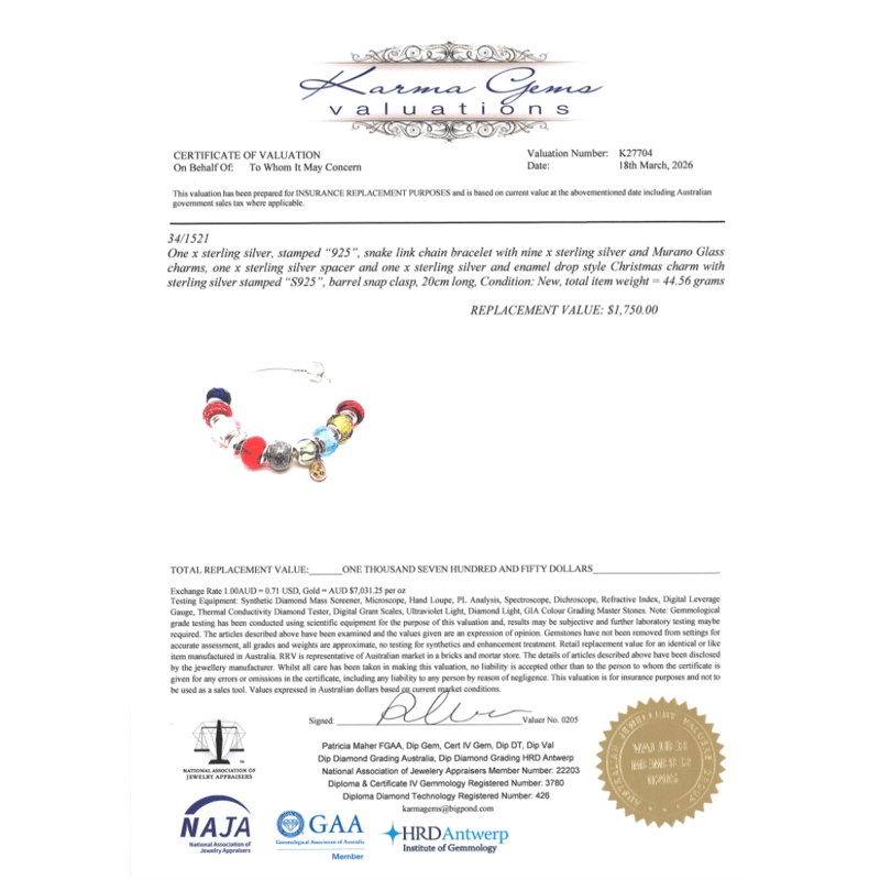 925 STERLING SILVER, MURANO GLASS BEAD AND CHARM BRACELET. The Bracelet Features, 11 Sterling Silver And Murano Glass Charms. The Sterling Silver Snake Link Bracelet Has A Sterling Silver Snap Clasp Closure. Total Item Weight Is 44.56 Grams. Valuations Provided by an Independent Third-Party Professional Not Directly Associated With Lloyds Auctions at AUD $$1,750.00This valuation has been conducted by an independent third-party professional. The valuation amount is an assessment by the issuing valuer and does not reflect the auction value of the item. Any inquiries regarding the valuation should be directed to the issuing valuer (refer to contact details on the certificate), as Lloyds Auctions has no affiliation or influence over the valuation, the valuer, or the stated amount. Condition: Good - Refer Images 0645973+1362
