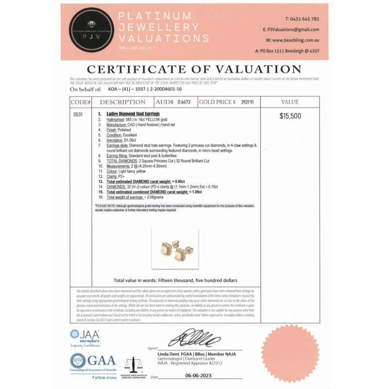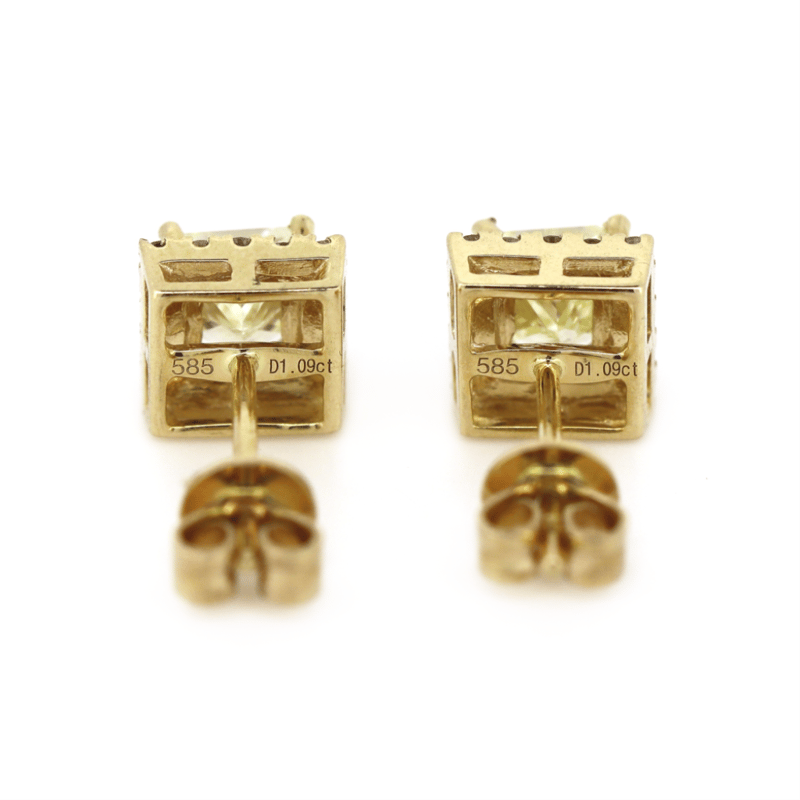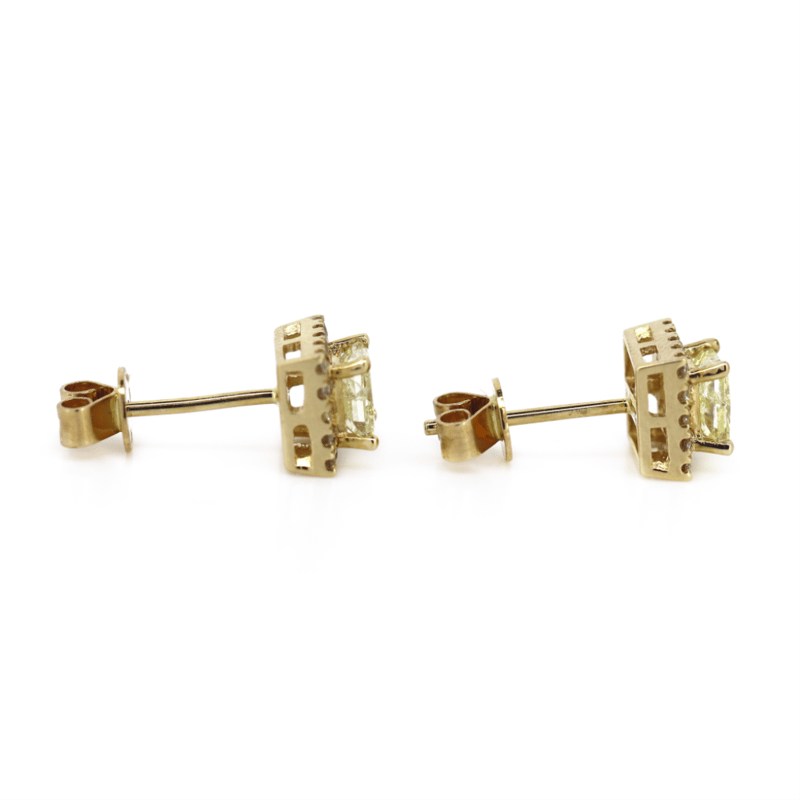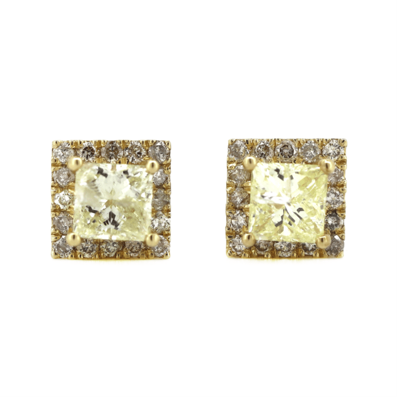 The Centres Feature, 2 Princess Cut, Light Fancy Yellow, Diamonds (0.90Ct Tdw, P2+ Clarity), 4 Claw Set. Surrounding The Centres In Halos Are, 32 Round Brilliant Cut, Diamonds (0.34Ct Tdw, H-J Colour, P2+ Clarity), Claw Set. The Earrings Have Post Backs, With 14K Yellow Gold Butterfly Clasps.