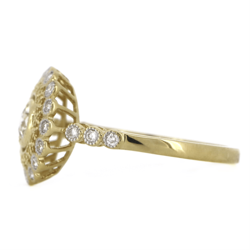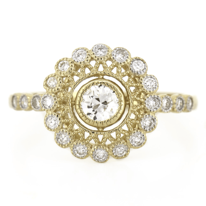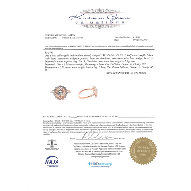 The Centre Features, One Mine Cut, Diamond (0.28Ct, H Colour, Si2 Clarity), Bezel Set. Surrounding The Centre In A Halo And Decorating The Shoulders Are, 22 Round Brilliant Cut, Diamonds (0.22Ct Tdw, H Colour, Si-I2 Clarity), Bezel Set With Millegrain Detail. Ring Size P.