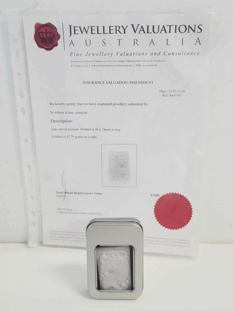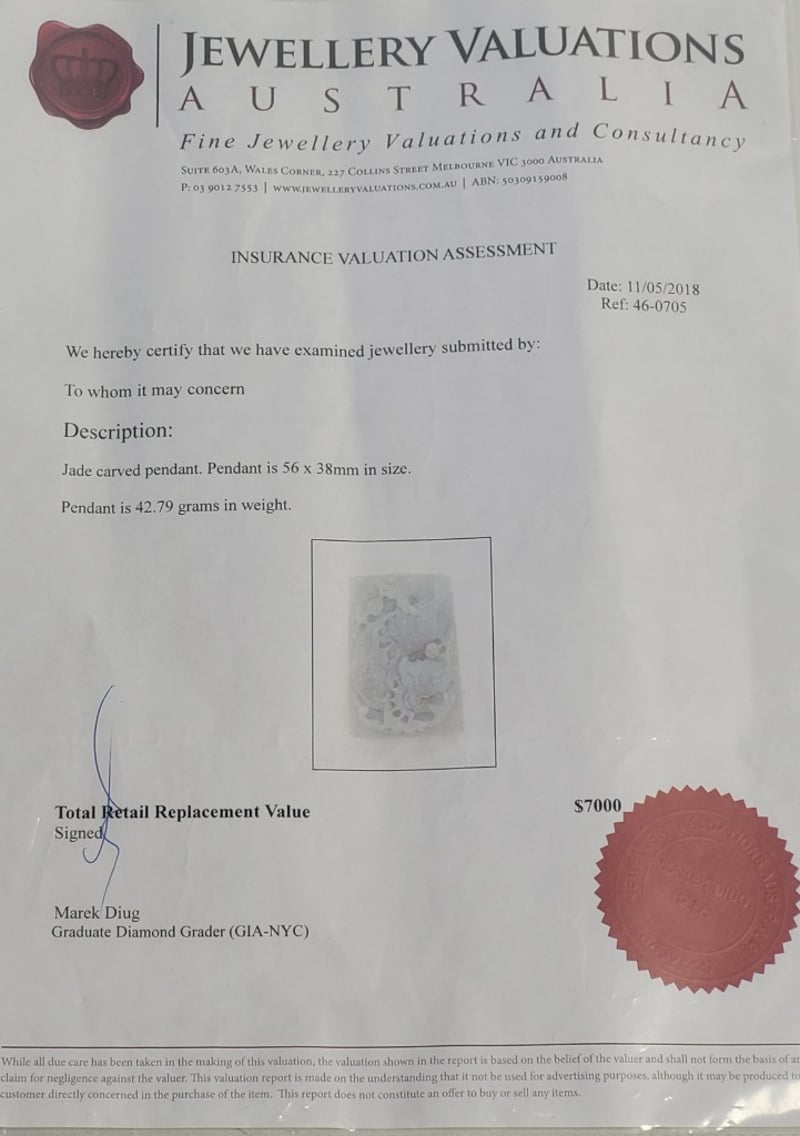 Includes Official Insurance Valuation Certificate, Carved Jade Pendant With Detailed Craftsmanship