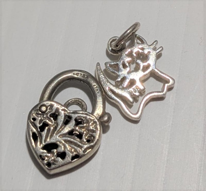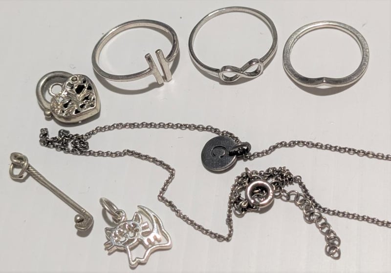 STERLING SILVER RINGS, PADLOCK, CHARMS & NECKLACE