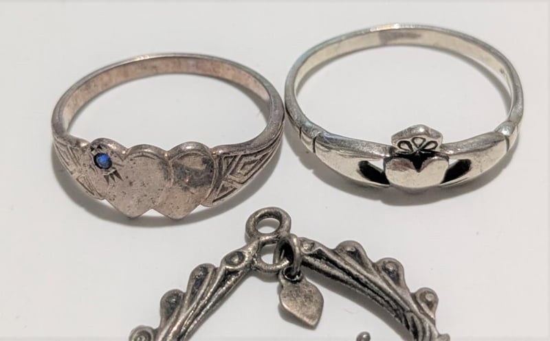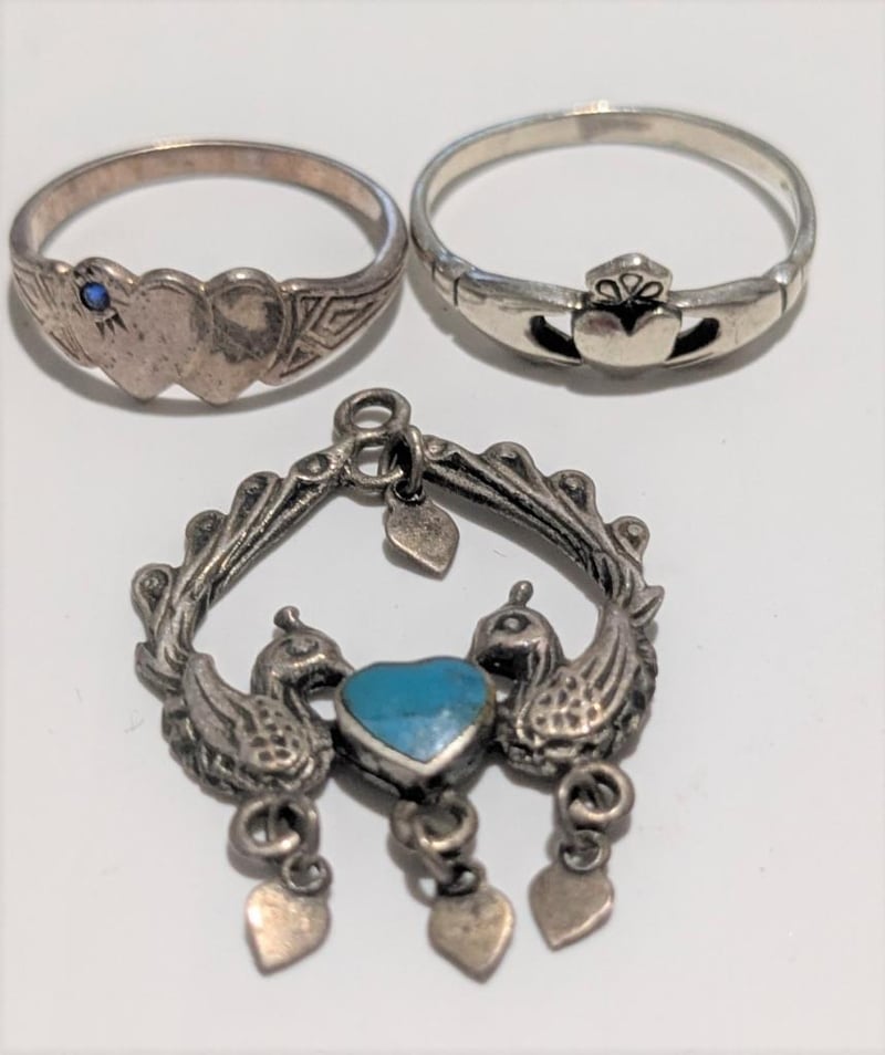 STERLING SILVER CLADDAGH RING, CIGNET RING & BIRD PENDANT