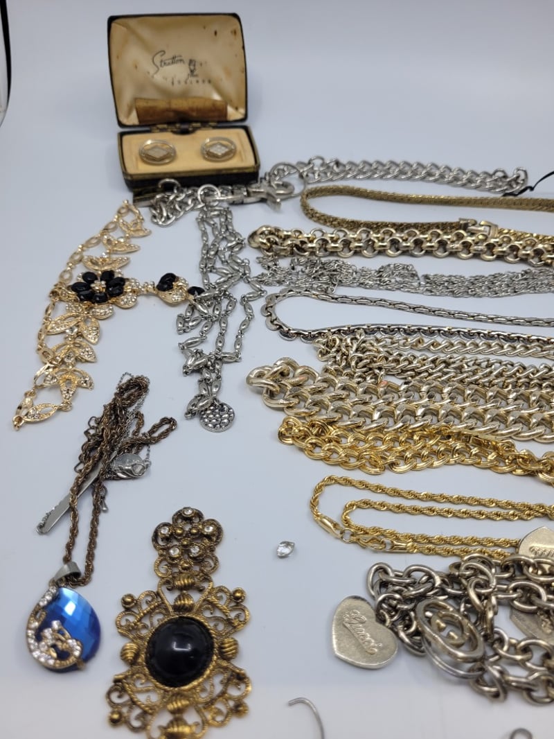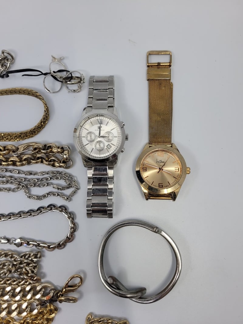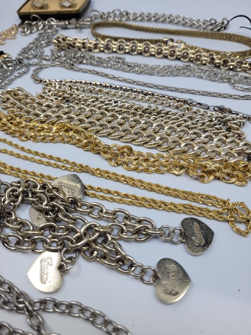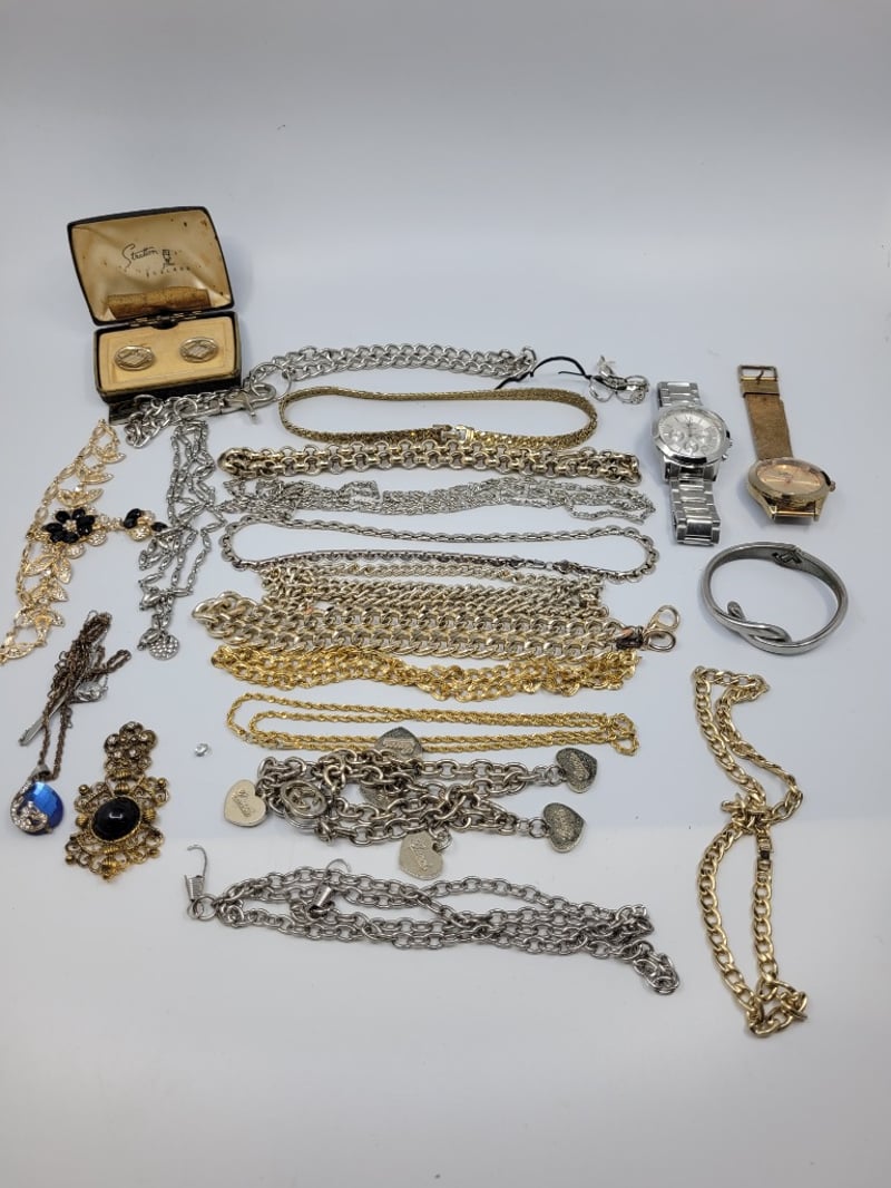 COLLECTION OF COSTUME JEWELLERY INCLUDING GOLD COLOURED AND SILVER COLOURED CHAINS,WATCHES AND MORE