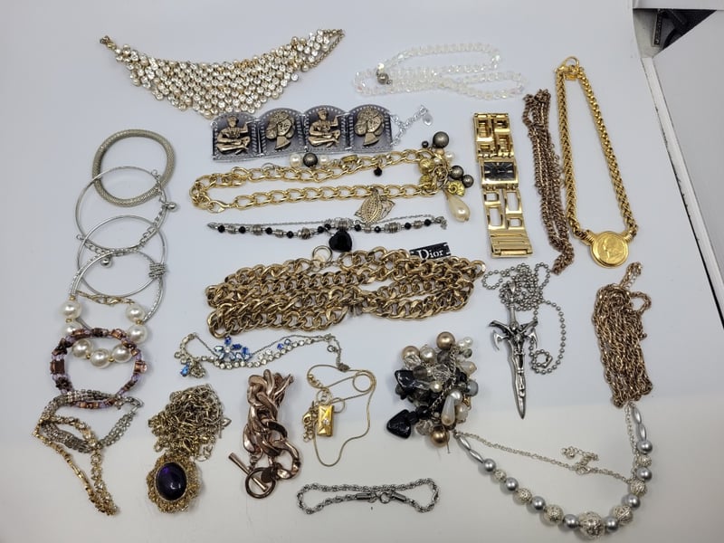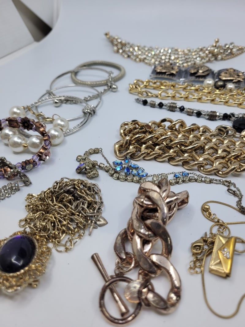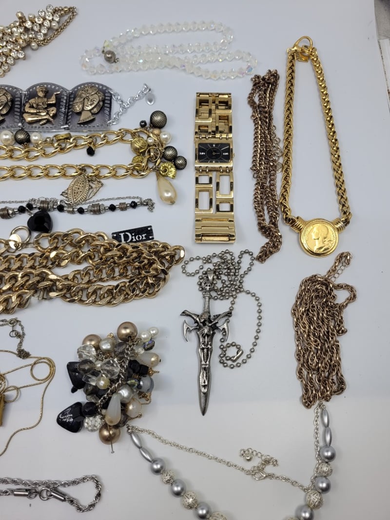 COSTUME JEWELLERY COLLECTION INCLUDING GOLD COLOURED AND SILVER COLOURED CHAINS, NECKLACES AND MORE