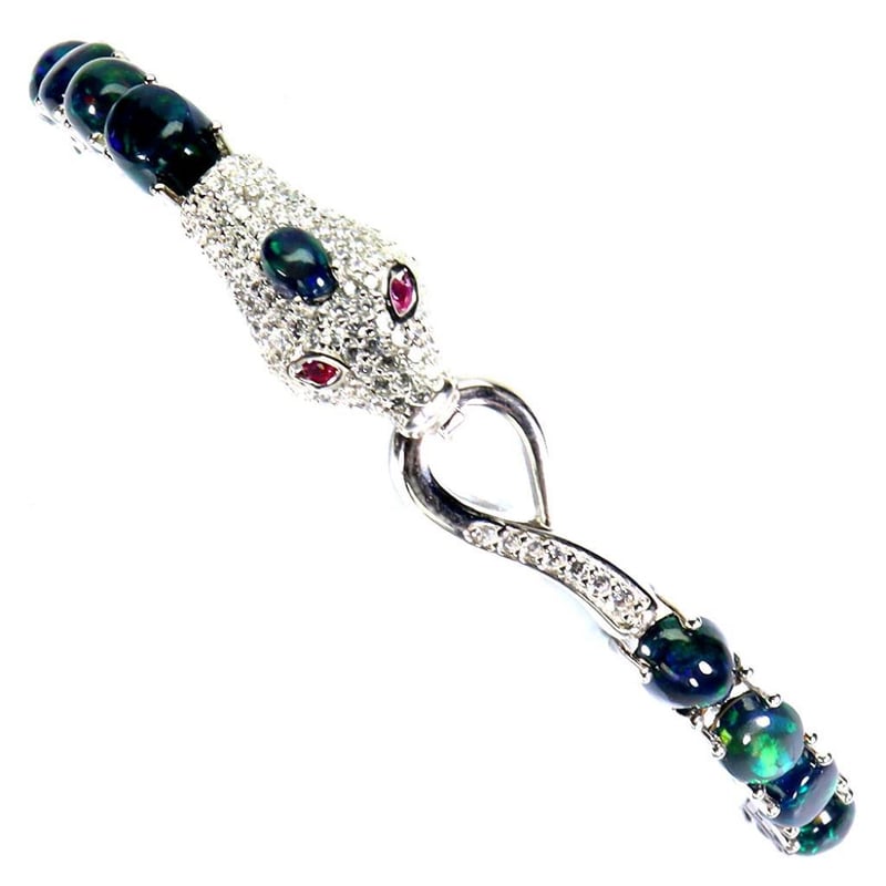 Natural Rainbow Black Opal Serpent Tennis Bracelet. Made In Solid Sterling Silver And Plated In14K White Gold. Features Natural Rainbow Fire Opals And Sparkling Czs. Bracelet Measures 7 Inches.