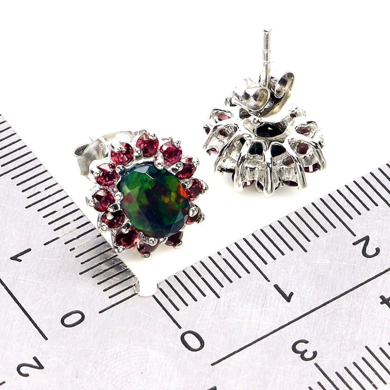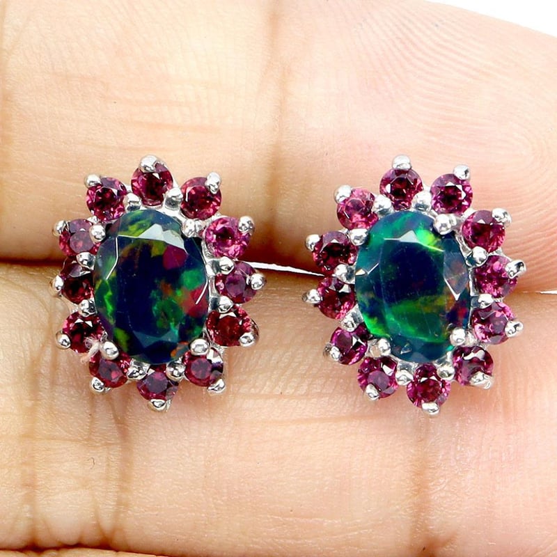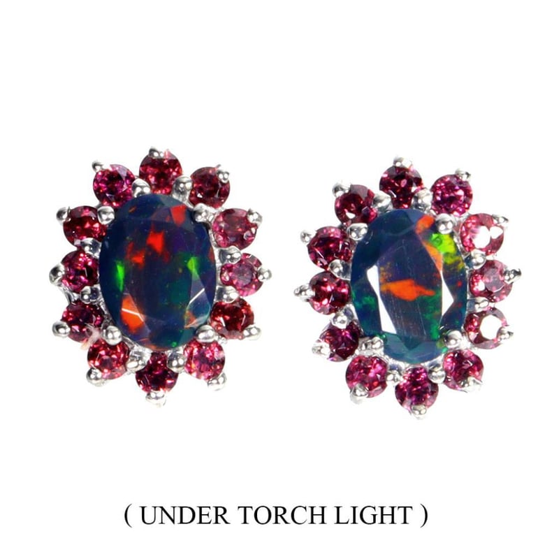 Natural Rainbow Fire Opal & Garnet Earrings. Made In Solid Sterling Silver And Plated In14K White Gold. Features Natural Rainbow Fire Opals And Natural Rhodolite Garnets. Earring Measure 14X12Mm
