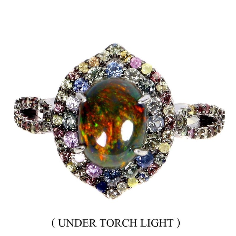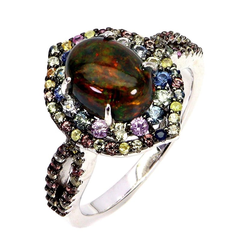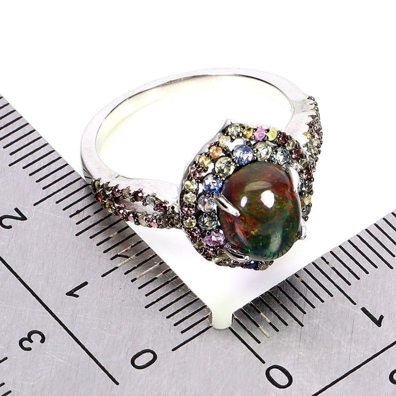 NATURAL OPAL & FANCY SAPPHIRE RING. Natural Opal & Fancy Sapphire Ring. Made In Solid Sterling Silver And Plated In14K White Gold. Features One Natural Oval Cabochon Rainbow Fire Opal And Natural Diamond Cut Fancy Sapphires. Ring Size 7 Condition: Good - Refer Images 010210+3