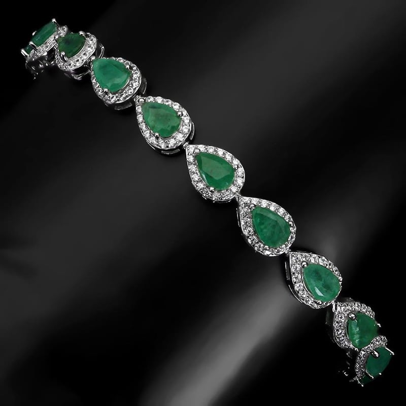 Natural Emerald Tennis Bracelet. Made In Solid Sterling Silver And Plated In14K White Gold. Features Natural Green Pear Facer Emeralds Surrounded By Sparkling Czs. Bracelet Measures 7.5 Inches