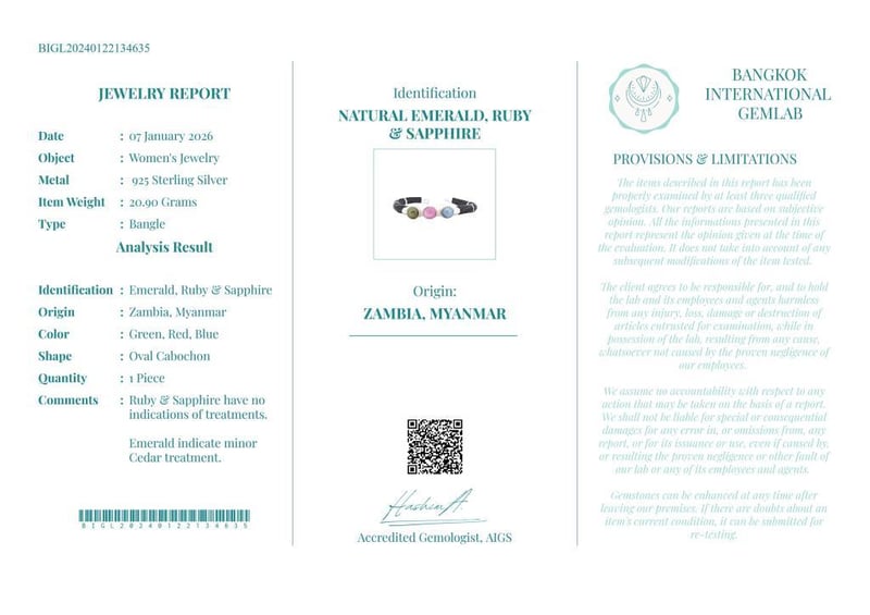 NATURAL EMERALD, RUBY & SAPPHIRE BANGLE ON 925 SILVER - WITH CERTIFICATE NOTE: STONES HAVE FALLEN OUT GEMSTONE : NATURAL EMERALD, RUBY & SAPPHIRE CERTIFICATE NUMBER : BIGL20240122134635 ITEM TOTAL WEIGHT : 20.90 GRAMS GEMSTONE COLOR : GREEN, RED, BLUE SHAPE : OVAL CABOCHON MEASUREMENT/SIZE : N/A COMMENTS : RUBY & SAPPHIRE HAVE NO INDICATIONS OF TREATMENTS. EMERALD INDICATE MINOR CEDAR TREATMENT. ? VERIFY REPORT ONLINE AT WWW.BANGKOKINTERNATIONALGEMLAB.CO TOORMINA 548677+6