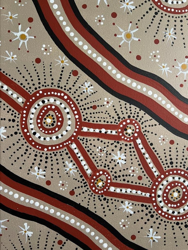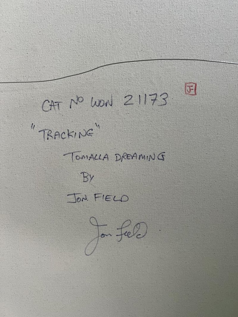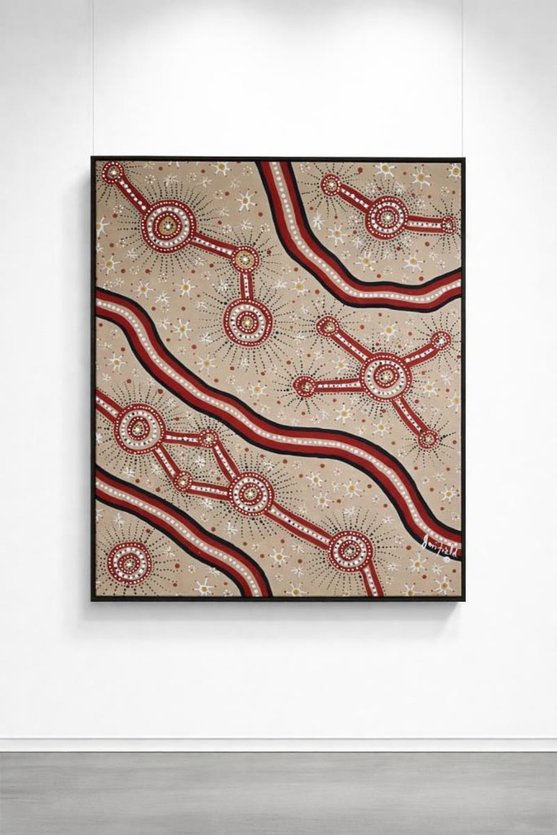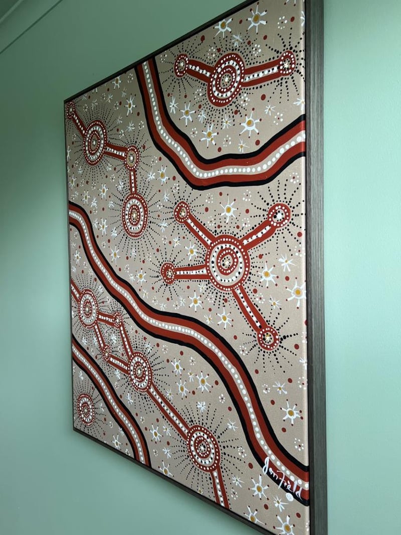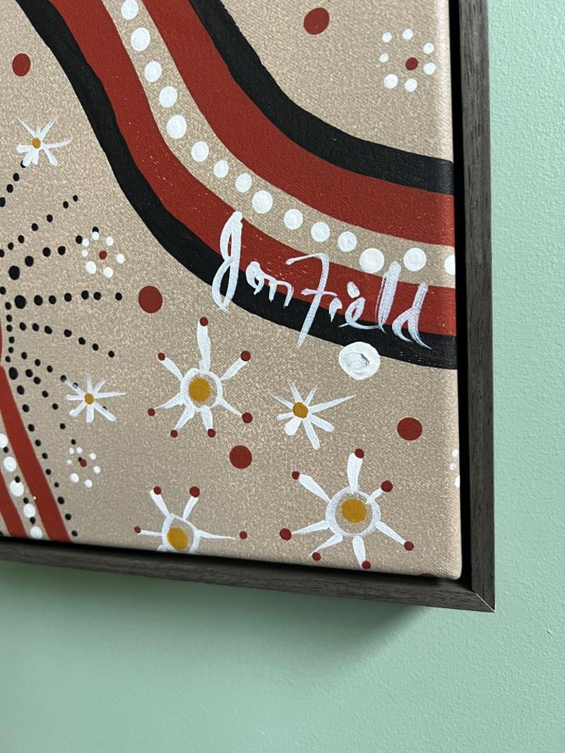 Title: Indigenous Dot Painting By Jon Field, Acrylic On Canvas In Dark Timber Shadowbox Frame