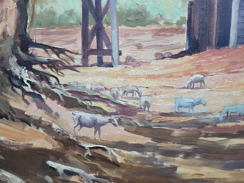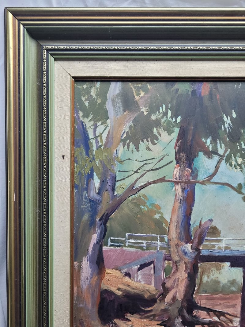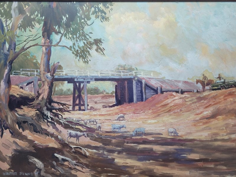 Provenance: Walter Bennetts Was An Accomplished Australian Landscape Painter Known For His Evocative Rural Scenes Capturing The Australian Outback And Farming Communities. His Work Is Characterised By Masterful Use Of Warm Earth Tones, Particularly The Distinctive Terracotta And Ochre Hues That Define The Inland Landscape. Bennetts Was Recognised For His Ability To Document Rural Australian Life, Depicting Working Farms, Infrastructure, And Pastoral Scenes With Both Technical Precision And Atmospheric Sensitivity. His Paintings Demonstrate A Sophisticated Understanding Of Light And Shadow, Capturing The Harsh Clarity Of Inland Daylight And The Distinctive Violet-Tinged Shadows Cast By Gum Trees. The Artist'S Compositions Often Feature Gum Trees As Compositional Anchors, Rendered With Characteristic Gnarled Trunks And Feathered Foliage.