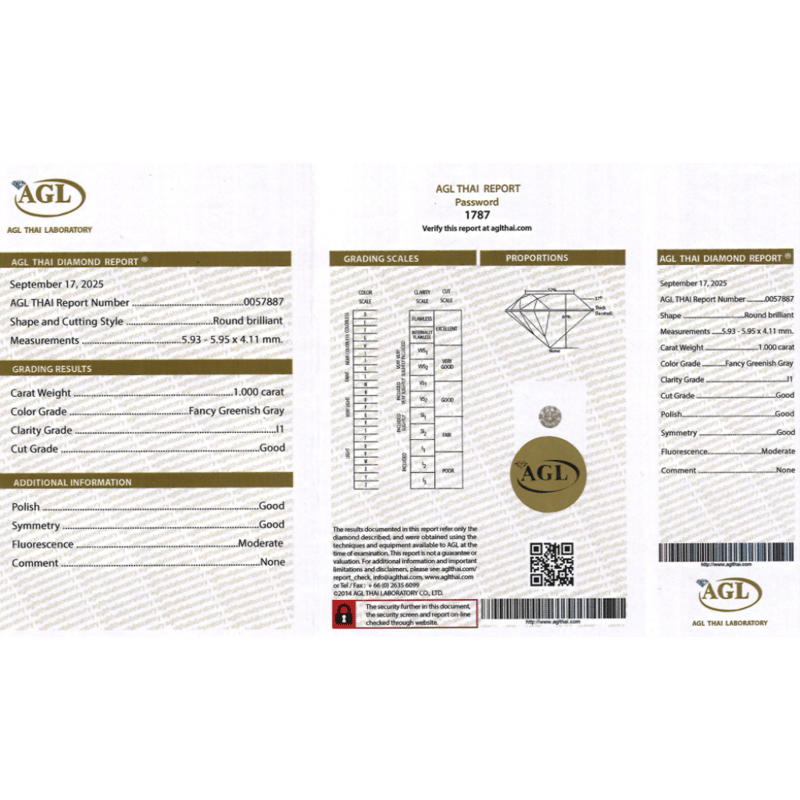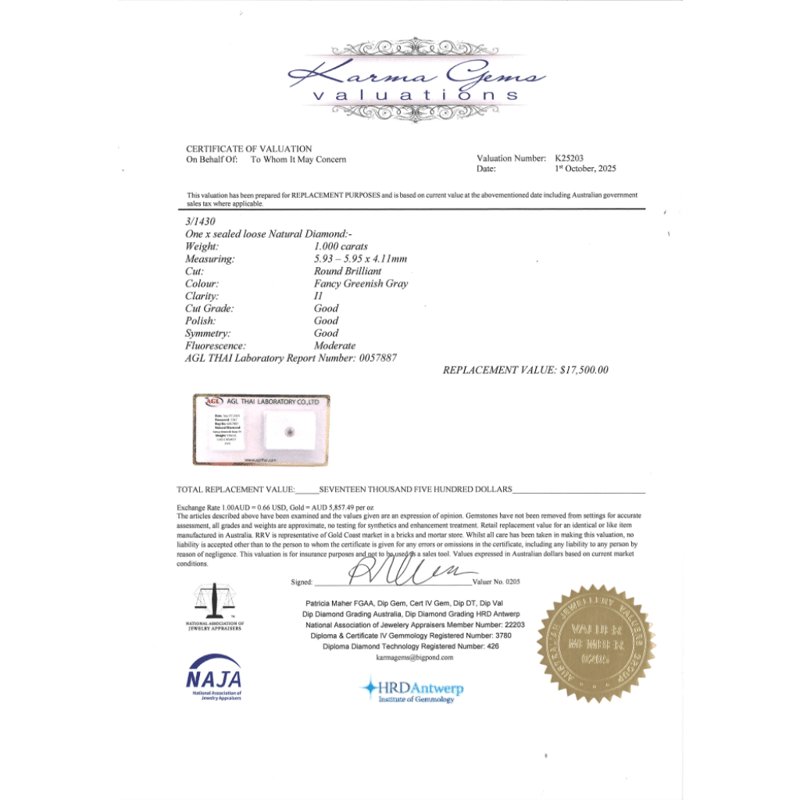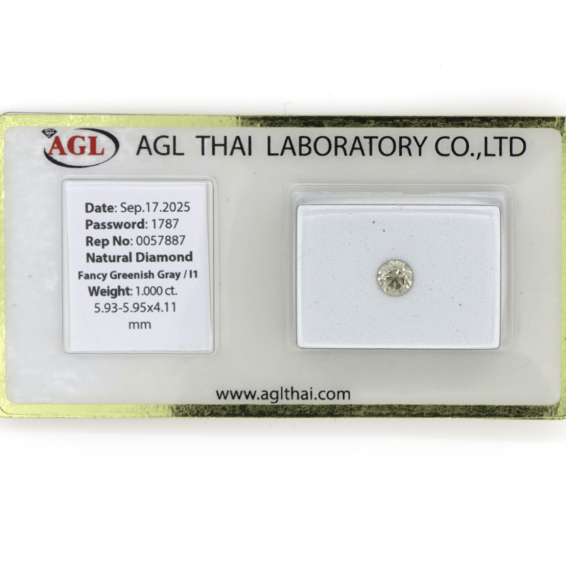 1.00CT CERTIFIED, NATURAL FANCY GREEN/GREY DIAMOND Round Brilliant Cut, Fancy Greenish-Grey Colour, I1 Clarity, Loose, Unset. Stone Comes Sealed With Agl Report: 0057887. Valuations Provided by an Independent Third-Party Professional Not Directly Associated With Lloyds Auctions at AUD $17500This valuation has been conducted by an independent third-party professional. The valuation amount is an assessment by the issuing valuer and does not reflect the auction value of the item. Any inquiries regarding the valuation should be directed to the issuing valuer (refer to contact details on the certificate), as Lloyds Auctions has no affiliation or influence over the valuation, the valuer, or the stated amount. Condition: Good - Refer Images 0645962+2126