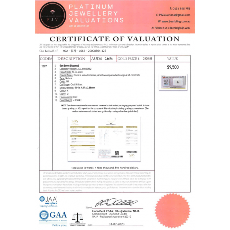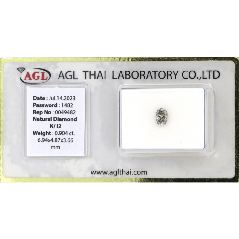 0.904CT CERTIFIED, NATURAL DIAMOND Oval Brilliant Cut, K Colour, I2 Clarity, Loose, Unset. The Stone Comes Sealed With Agl Report: 0049482. Valuations Provided by an Independent Third-Party Professional Not Directly Associated With Lloyds Auctions at AUD $9500This valuation has been conducted by an independent third-party professional. The valuation amount is an assessment by the issuing valuer and does not reflect the auction value of the item. Any inquiries regarding the valuation should be directed to the issuing valuer (refer to contact details on the certificate), as Lloyds Auctions has no affiliation or influence over the valuation, the valuer, or the stated amount. Condition: Fair - Refer To Images 0645962+2129