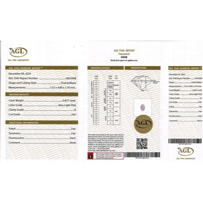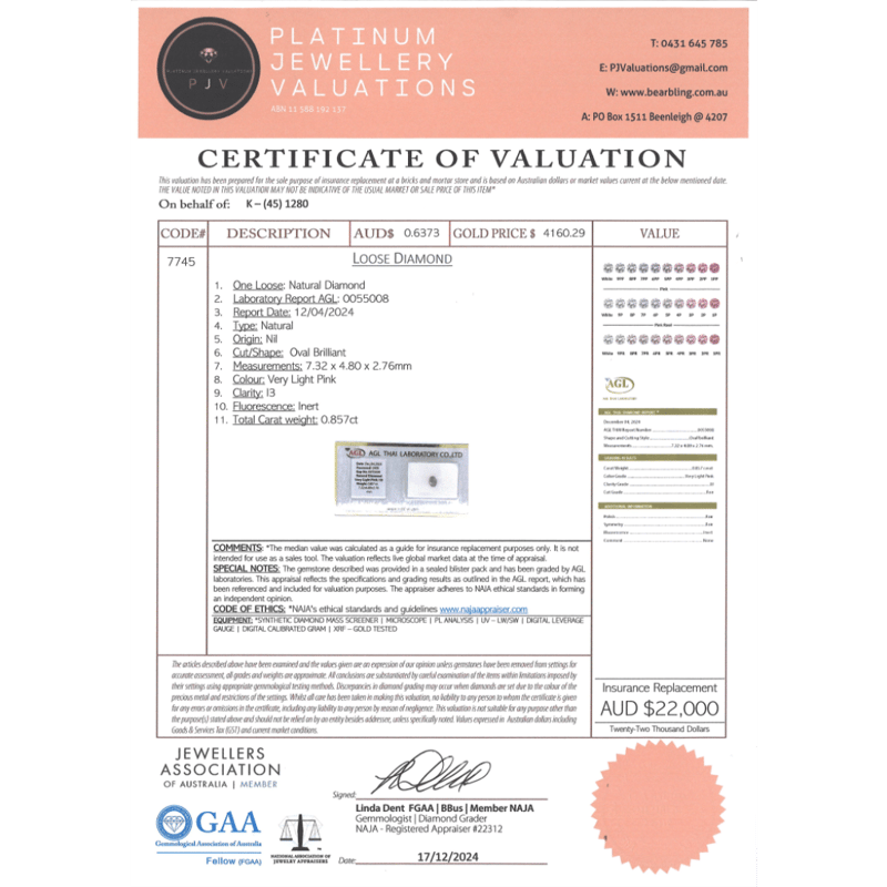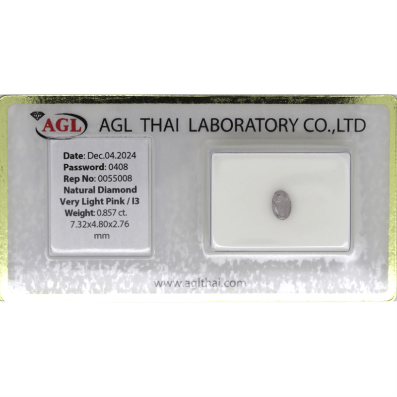 Oval Brilliant Cut, Very Light Pink Colour, I3 Clarity, Loose, Unset. Stone Comes Sealed With Agl Report: 0055008.
