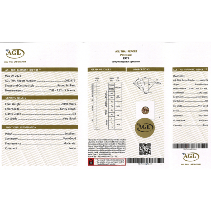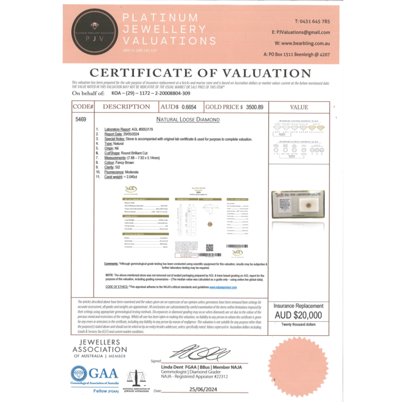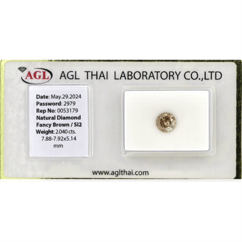 2.04CT CERTIFIED, NATURAL FANCY BROWN DIAMOND Round Brilliant Cut, Fancy Brown, Si2 Clarity, Loose, Unset. Stone Comes Sealed With Agl Report: 0053179. Valuations Provided by an Independent Third-Party Professional Not Directly Associated With Lloyds Auctions at AUD $20000This valuation has been conducted by an independent third-party professional. The valuation amount is an assessment by the issuing valuer and does not reflect the auction value of the item. Any inquiries regarding the valuation should be directed to the issuing valuer (refer to contact details on the certificate), as Lloyds Auctions has no affiliation or influence over the valuation, the valuer, or the stated amount. Condition: Good - Refer Images 0645962+2140