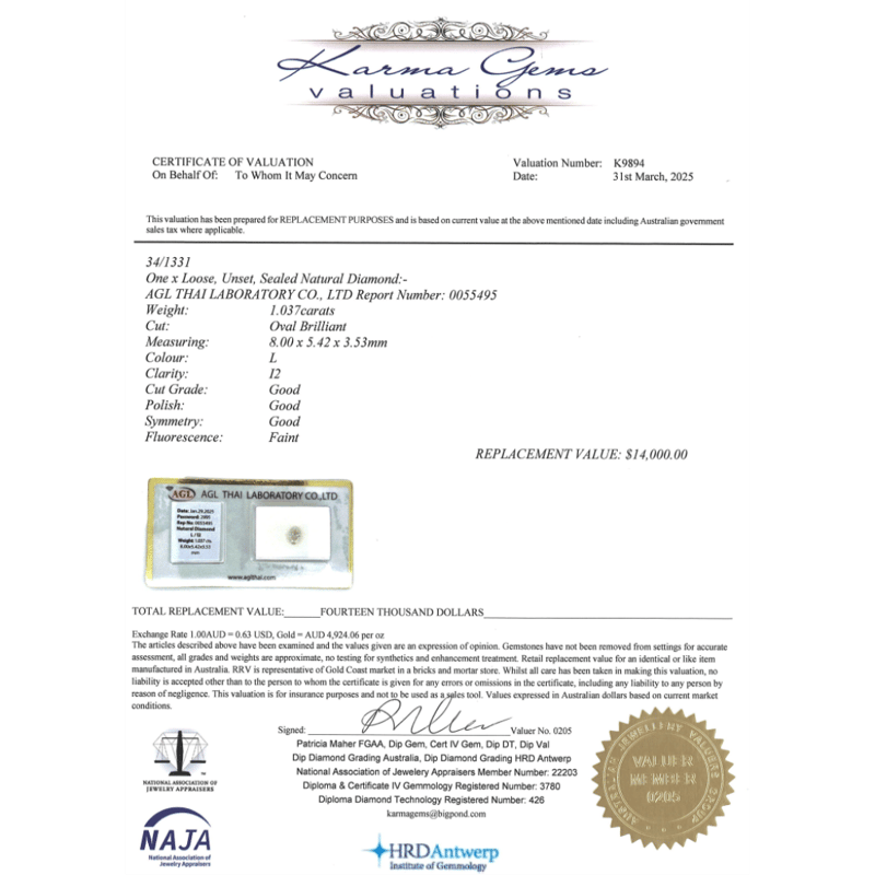 1.037CT CERTIFIED, NATURAL DIAMOND