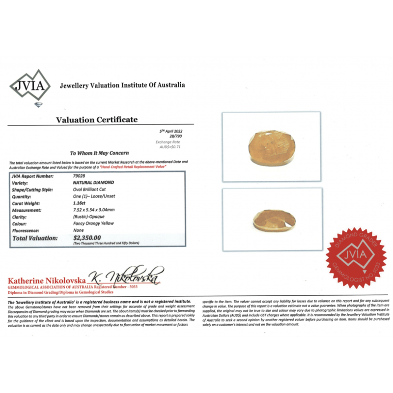 Oval Brilliant Cut, Fancy Orangey Yellow, Opaque, Loose, Unset.