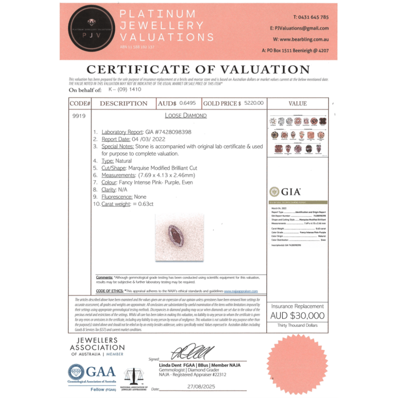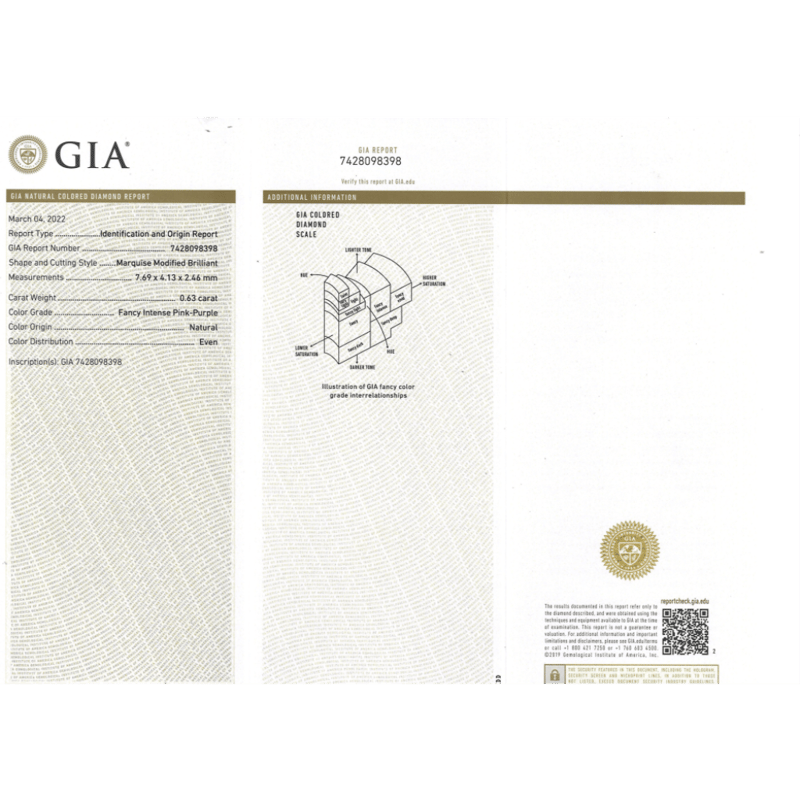 Marquise Modified Brilliant Cut, Fancy Intense Pink-Purple Colour, Loose, Unset. Stone Comes With Gia Report: 7428098398.