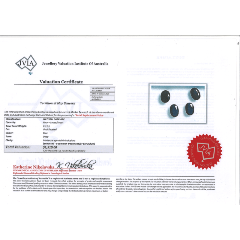 2.11CT TSW X 4, NATURAL CORUNDUM SAPPHIRES Oval Faceted Cut, Deep Blue, Moderate Eye Visible Inclusions, Enhanced, Loose, Unset. Valuations Provided by an Independent Third-Party Professional Not Directly Associated With Lloyds Auctions at AUD $$1,510.00This valuation has been conducted by an independent third-party professional. The valuation amount is an assessment by the issuing valuer and does not reflect the auction value of the item. Any inquiries regarding the valuation should be directed to the issuing valuer (refer to contact details on the certificate), as Lloyds Auctions has no affiliation or influence over the valuation, the valuer, or the stated amount. Condition: Good - Refer Images 0645966+2213