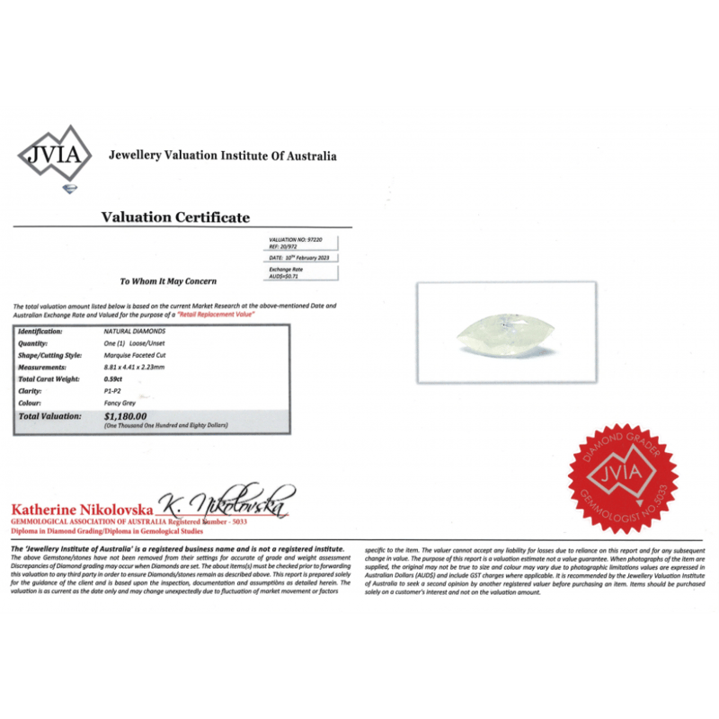 0.59CT NATURAL DIAMOND Marquise Faceted Cut, Fancy Grey, P1-P2 Clarity, Loose, Unset. Valuations Provided by an Independent Third-Party Professional Not Directly Associated With Lloyds Auctions at AUD $$1,180.00This valuation has been conducted by an independent third-party professional. The valuation amount is an assessment by the issuing valuer and does not reflect the auction value of the item. Any inquiries regarding the valuation should be directed to the issuing valuer (refer to contact details on the certificate), as Lloyds Auctions has no affiliation or influence over the valuation, the valuer, or the stated amount. Condition: Good - Refer Images 0645966+2216