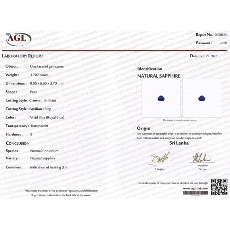 Pear Cut, Medium Dark Royal Blue, Moderate Eye Visible Inclusions, Heat Enhanced, Sri Lanka (Ceylon) Origin, Loose, Unset. Stone Comes Sealed With Agl Report: 0050830.