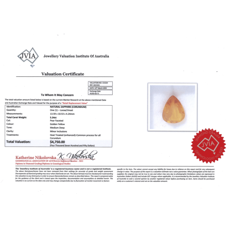 5.34CT NATURAL YELLOW CORUNDUM SAPPHIRE Pear Faceted Cut, Medium Deep-Deep Yellow, Minor Inclusions, Loose, Unset. Valuations Provided by an Independent Third-Party Professional Not Directly Associated With Lloyds Auctions at AUD $$4,750.00This valuation has been conducted by an independent third-party professional. The valuation amount is an assessment by the issuing valuer and does not reflect the auction value of the item. Any inquiries regarding the valuation should be directed to the issuing valuer (refer to contact details on the certificate), as Lloyds Auctions has no affiliation or influence over the valuation, the valuer, or the stated amount. Condition: Good - Refer Images 0645966+2226