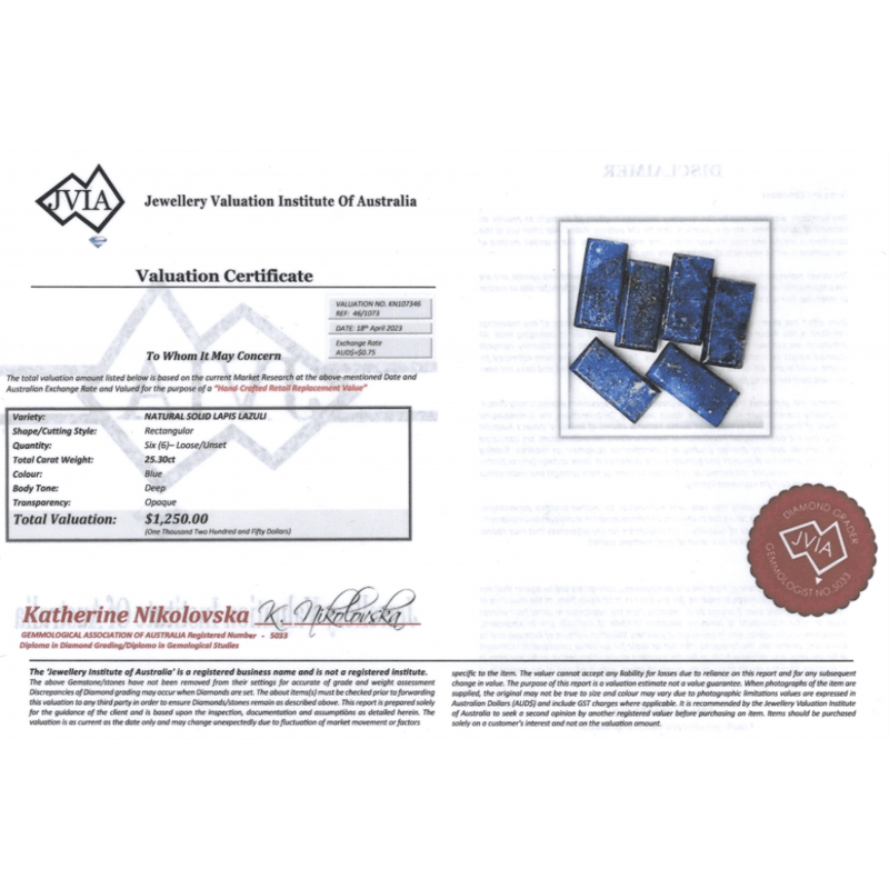 25.30CT TSW X 6, NATURAL SOLID LAPIS LAZULI Rectangular Cut, Deep Blue, Opaque, Loose, Unset. Valuations Provided by an Independent Third-Party Professional Not Directly Associated With Lloyds Auctions at AUD $$1,250.00This valuation has been conducted by an independent third-party professional. The valuation amount is an assessment by the issuing valuer and does not reflect the auction value of the item. Any inquiries regarding the valuation should be directed to the issuing valuer (refer to contact details on the certificate), as Lloyds Auctions has no affiliation or influence over the valuation, the valuer, or the stated amount. Condition: Good - Refer Images 0645966+2231