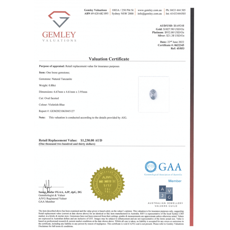 0.88CT CERTIFIED, NATURAL TANZANITE
